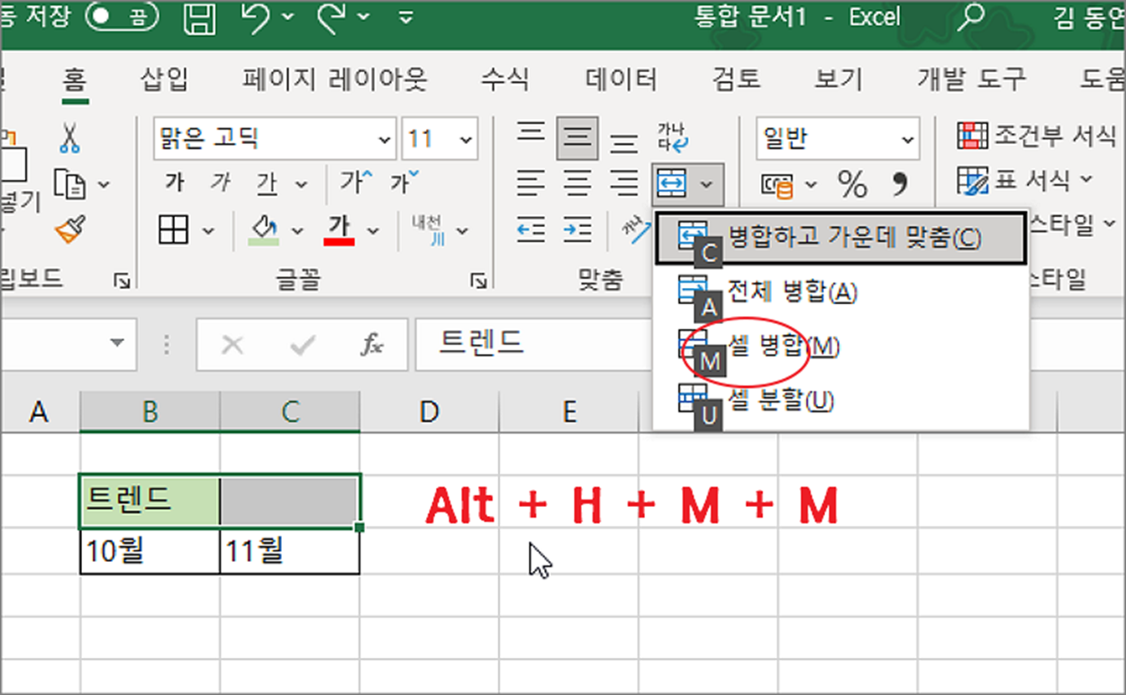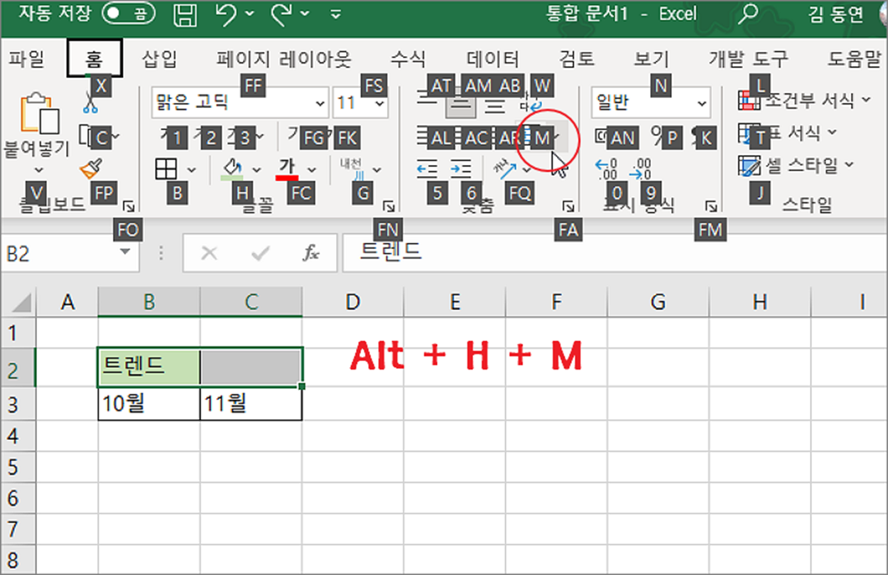 ▼ 두 번째 단계는 병합 리본 메뉴를 가리키는 알파벳을 찾습니다. M 으로 표시되어 있으므로 합쳐서 Alt + H + M 을 차례대로 눌러야 합니다.