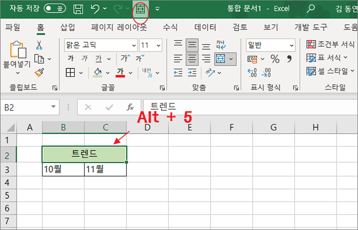 ▼ 병합할 셀을 선택하고 Alt + 5 를 눌러 보세요. 셀이 병합되는 것을 확인할 수 있습니다. 처음에 리본 메뉴 단축키보다 훨씬 간단하고 기억하기 쉽습니다.