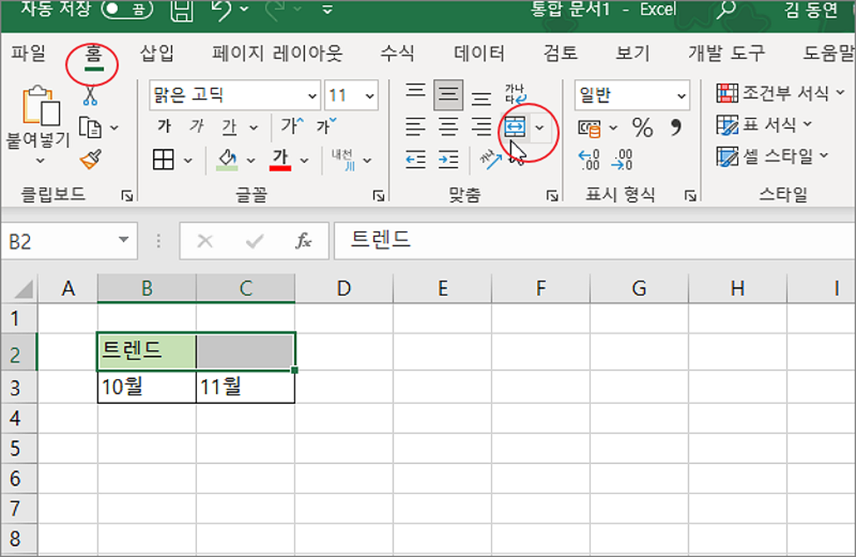 ▼ 병합 메뉴는 홈 탭 > 조합 그룹에 있습니다. 병합할 셀 영역을 선택하고 병합 메뉴를 클릭합니다. 매번 찾아서 클릭하기 귀찮다면 단축키를 이용할 수도 있습니다.