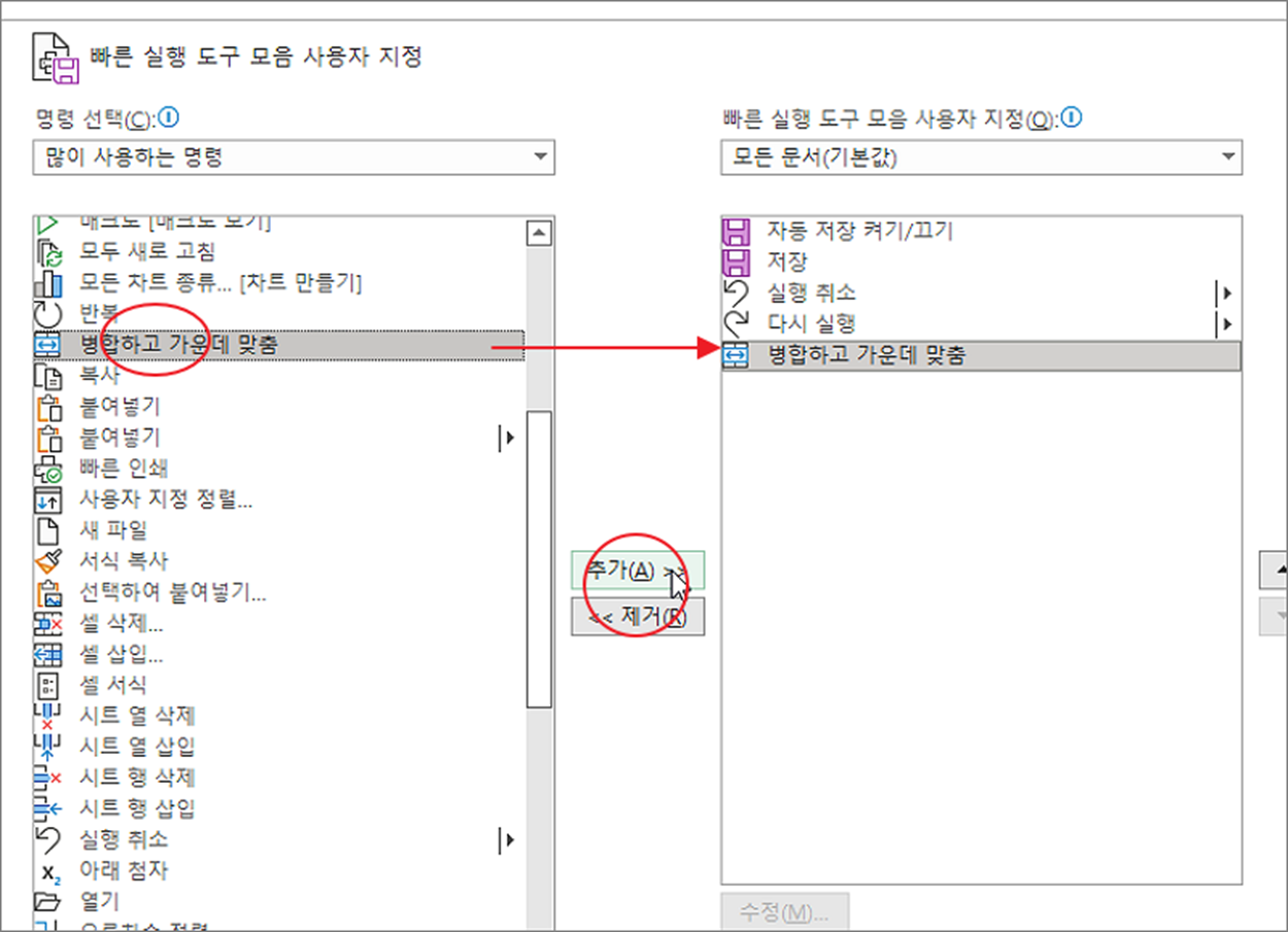 ▼ 빠른 실행 도구 모음 의 왼쪽 명령 모음에서 병합하고 가운데 맞춤을 찾습니다. 그리고 중간에 추가 버튼을 눌러 오른쪽 목록으로 옮깁니다.