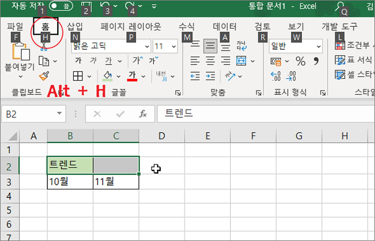 ▼ 일반적인 리본 메뉴의 단축키를 찾기 위해서는 아래와 같은 단계를 거쳐야 합니다. 첫 번째는 상단 탭에서 홈 탭 단축키를 찾아야 합니다. 그림에서 볼 수 있듯이 단축키는 Alt + H 입니다.