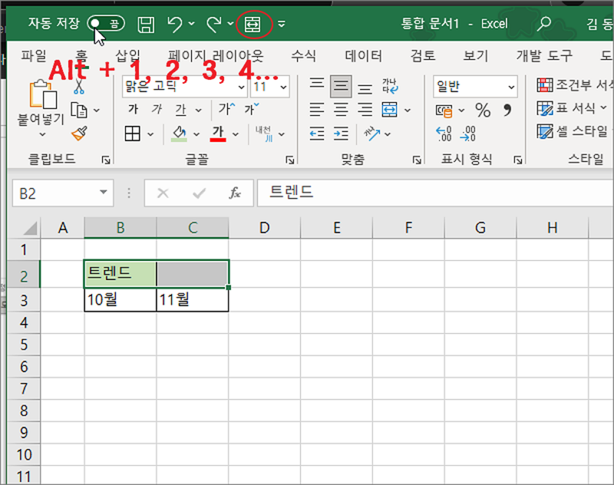 엑셀에서 특정 리본 메뉴를 단축키로 사용하기에는 조합해야 할 키가 너무 많습니다. 보통 사용자가 인식하는 단축키는 Alt, Ctrl, Shift 중 하나와 알파벳으로 하나로 이루어집니다. 키 조합이 2개 보다 많으면 기억하기도 어렵습니다. 그래서 자주 사용하는 리본 메뉴는 화면 상단에 있는 빠른 실행 도구에 등록해서 사용합니다. 빠른 실행도구에 등록된 메뉴는 왼쪽부터 Alt + 1, 2, 3 … 단축키를 사용합니다.