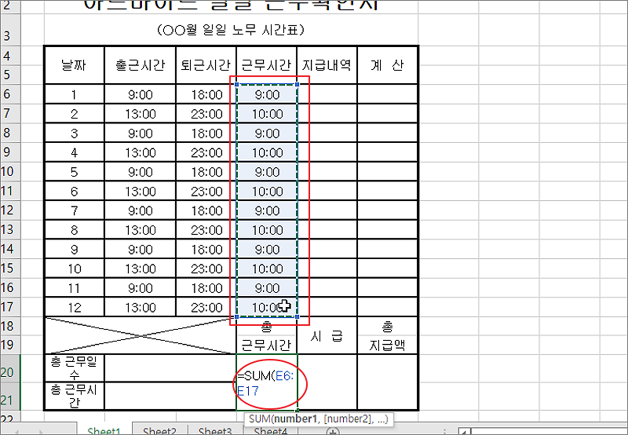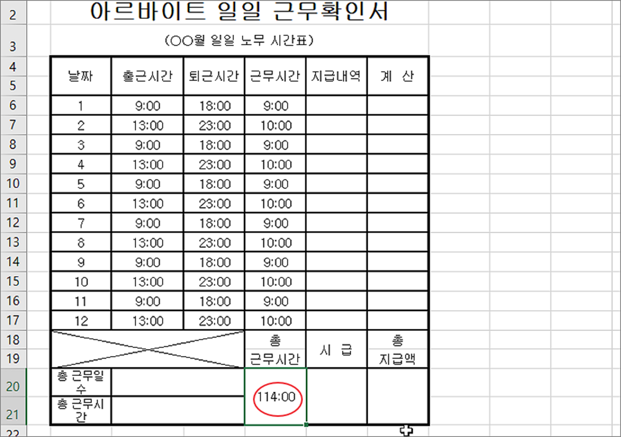 ▼ 전체 근무한 시간을 계산해서 총 지급액을 계산해 보았습니다.