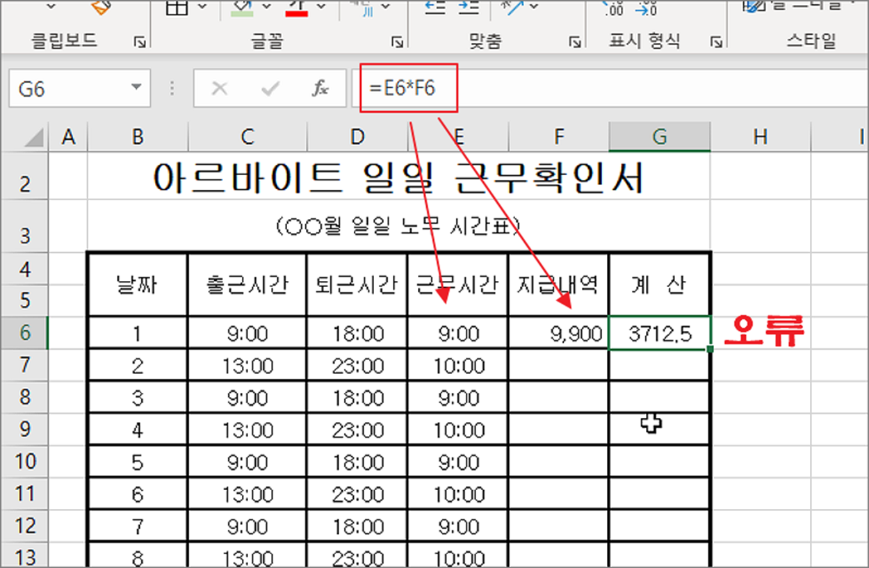 ▼ 다음은 일한 시간만큼 얼마나 비용을 지불해야 하는지 계산해 보겠습니다. “근무시간” 과 시급인 9900 을 곱하면 하루 일당이 나와야 합니다. 그런데 결과는 예상했던 것과 다르게 나옵니다.