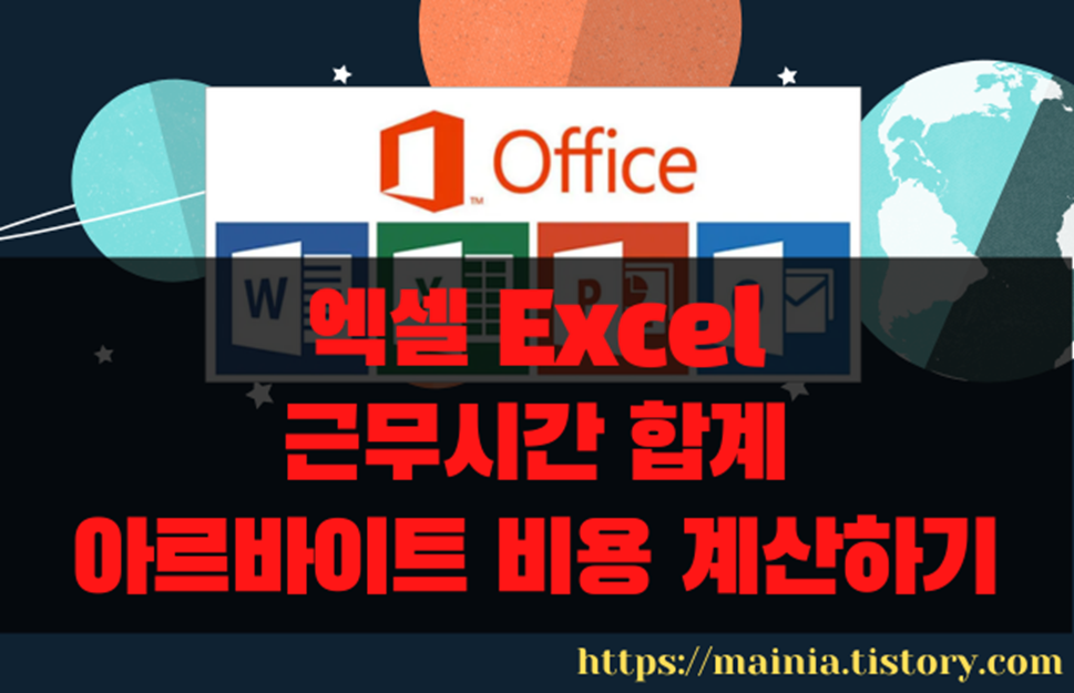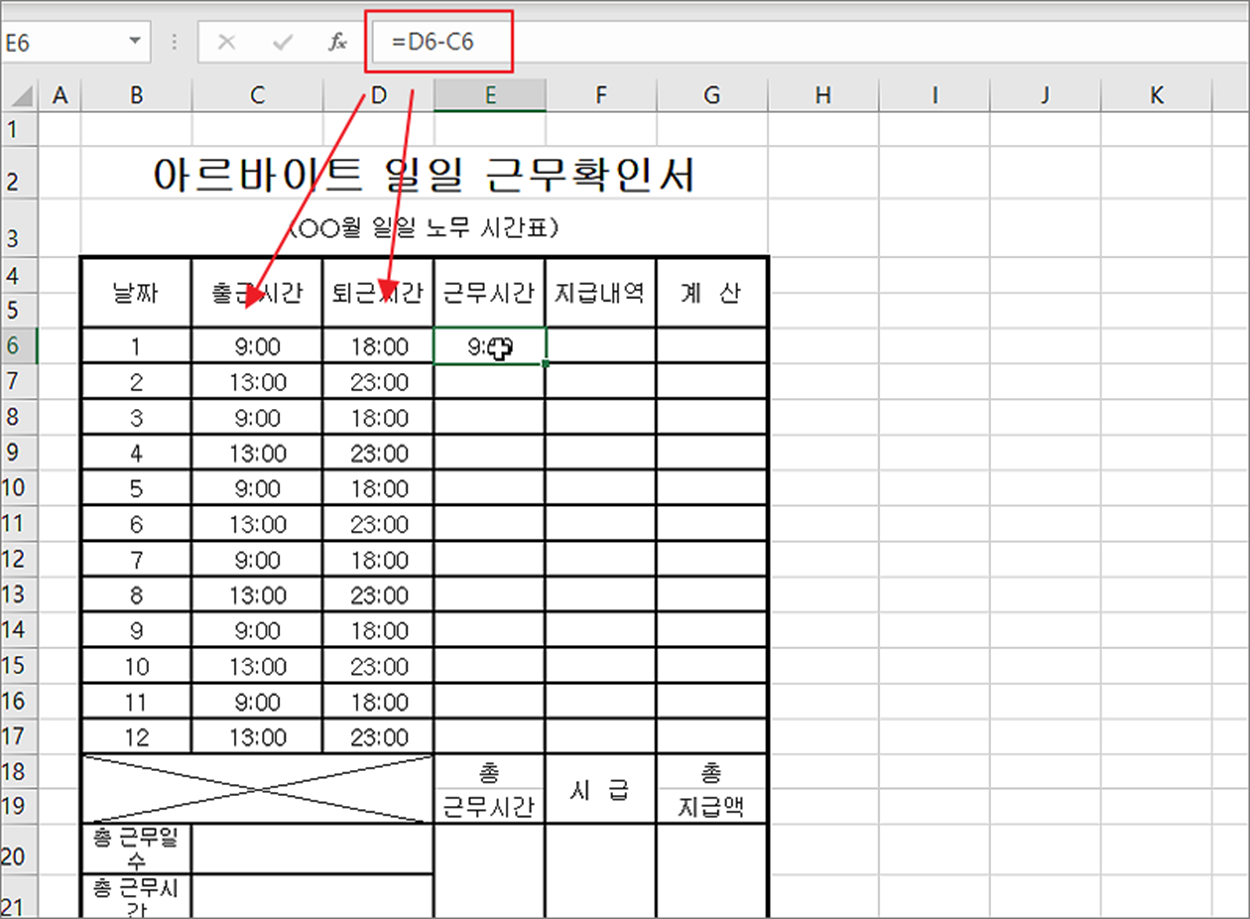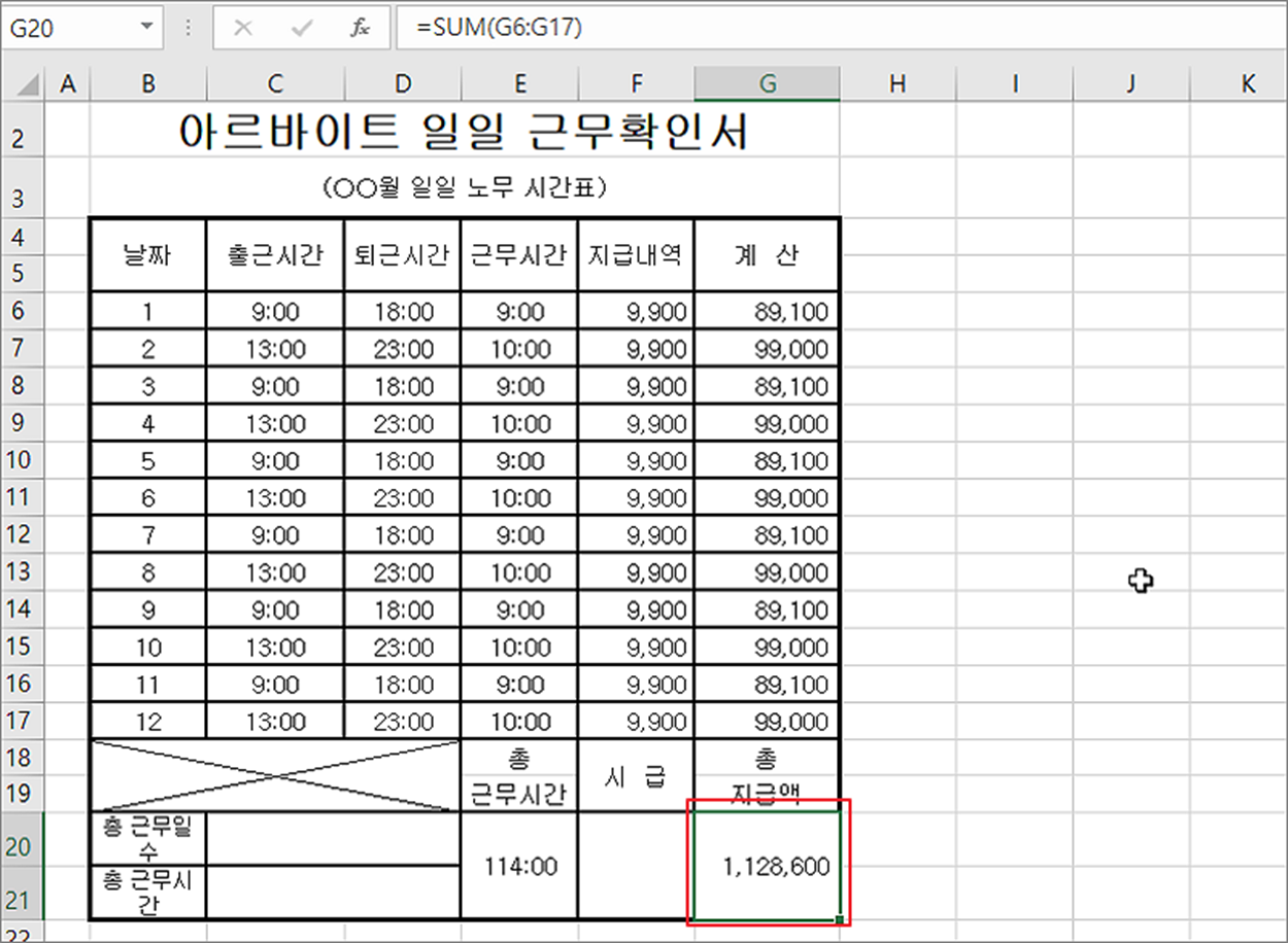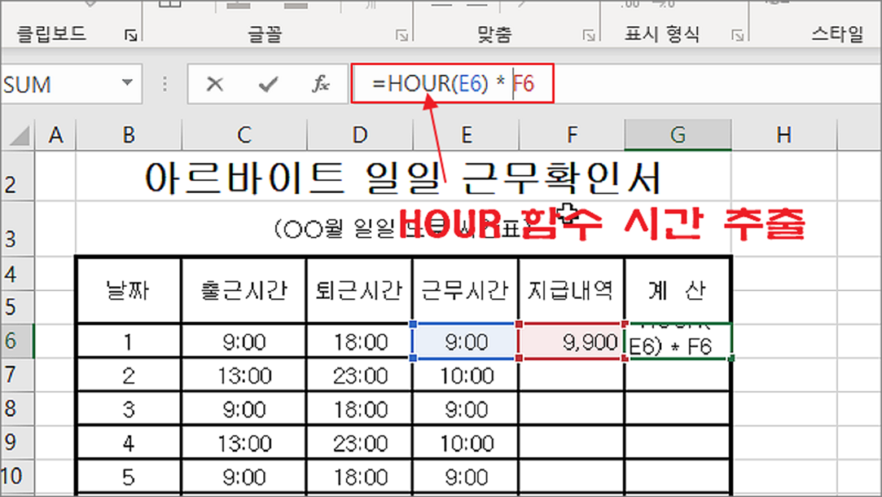 자신의 가게에서 근무한 아르바이트생의 근무한 시간 전체를 계산해서 월급날에 얼마나 지급해야 하는지 계산하는 방법을 알아보겠습니다. 계산에 쓰인 함수는 HOUR 와 기초적인 사칙연산으로 가능합니다. 어렵지 않으니 하나씩 따라해 보시기 바랍니다.