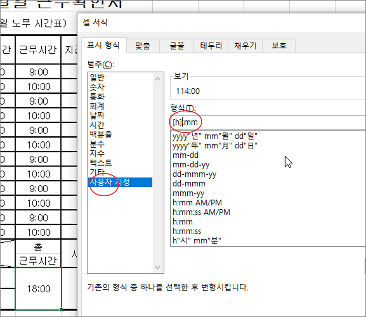 ▼ 표시 형식 > 사용자 지정 > 형식 으로 가서 “[h]:mm” 을 입력합니다.