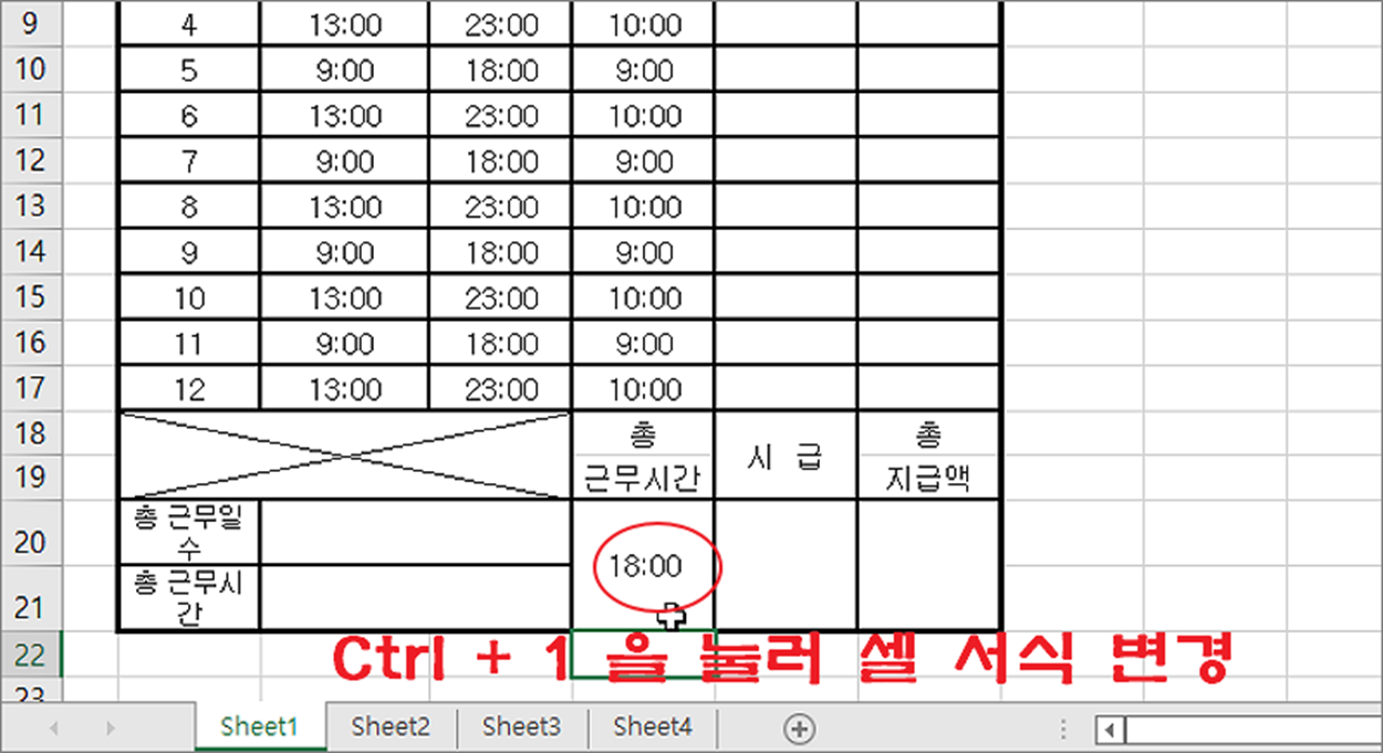 ▼ 시간을 모두 합산한 결과 원하는 값이 나오지 않았습니다. 왜 이렇게 나왔을 까요? 이것은 셀을 24시간으로 표현했기 때문입니다. 셀 서식에서 다시 “분” 으로 변경해야 합니다. Ctrl + 1 을 눌러 셀 서식 창을 띄웁니다.