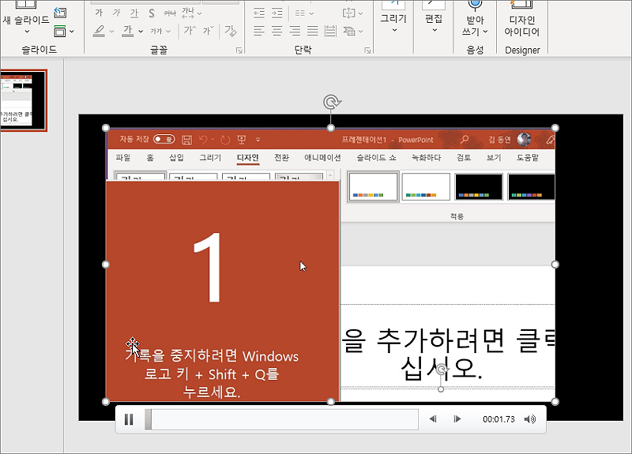 ▼ 기록을 중지하는 순간 슬라이드에 지금까지 녹화한 동영상이 추가가 됩니다. 그림처럼 컴퓨터 화면을 녹화한 동영상이 보입니다.