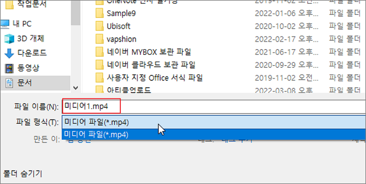 ▼ 다른 이름으로 저장 창이 뜨면 파일 이름을 정하고 적당한 위치에 저장합니다. 확장자는 mp4 하나만 지원합니다.