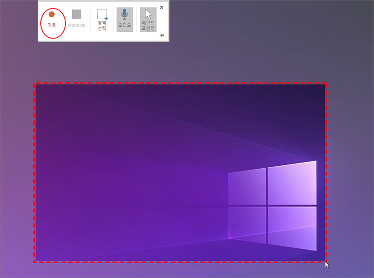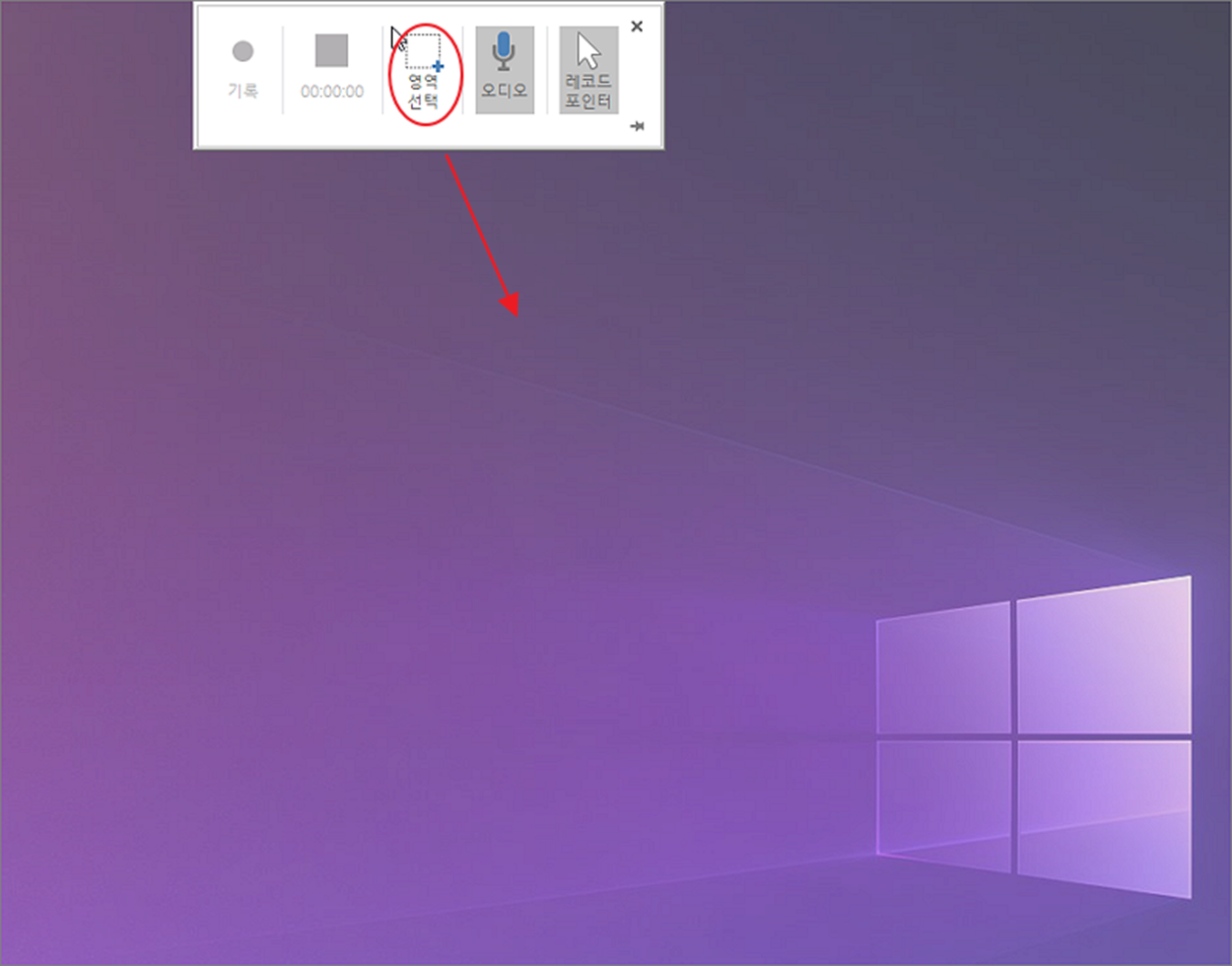▼ 컴퓨터 바탕화면이 흐리게 변하면서 상단에는 녹화 관련 메뉴들을 모아 놓은 바가 나타납니다. 여기에서 영역 선택 을 눌러 컴퓨터 화면에서 녹화하고 싶은 곳에 사각형 영역을 만듭니다. 마우스로 드래그하면서 영역의 크기를 조절합니다.