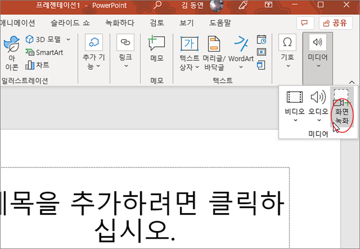 ▼ 미디어 하위 리본 메뉴에서 화면 녹화 를 클릭합니다.