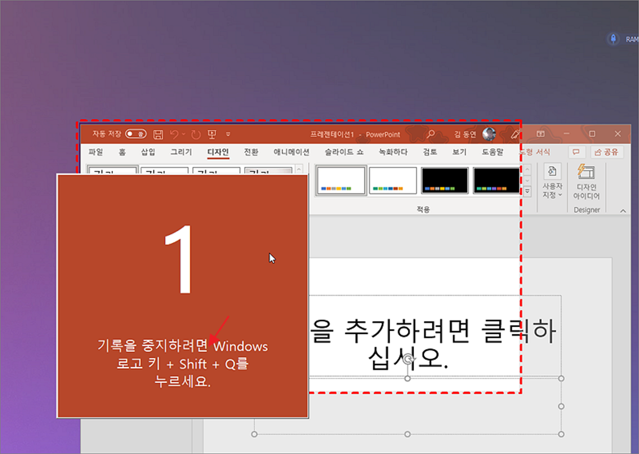 ▼ 기록 중지 단축키는 키보드에서 Windows 로고 키 + Shift + Q 입니다.