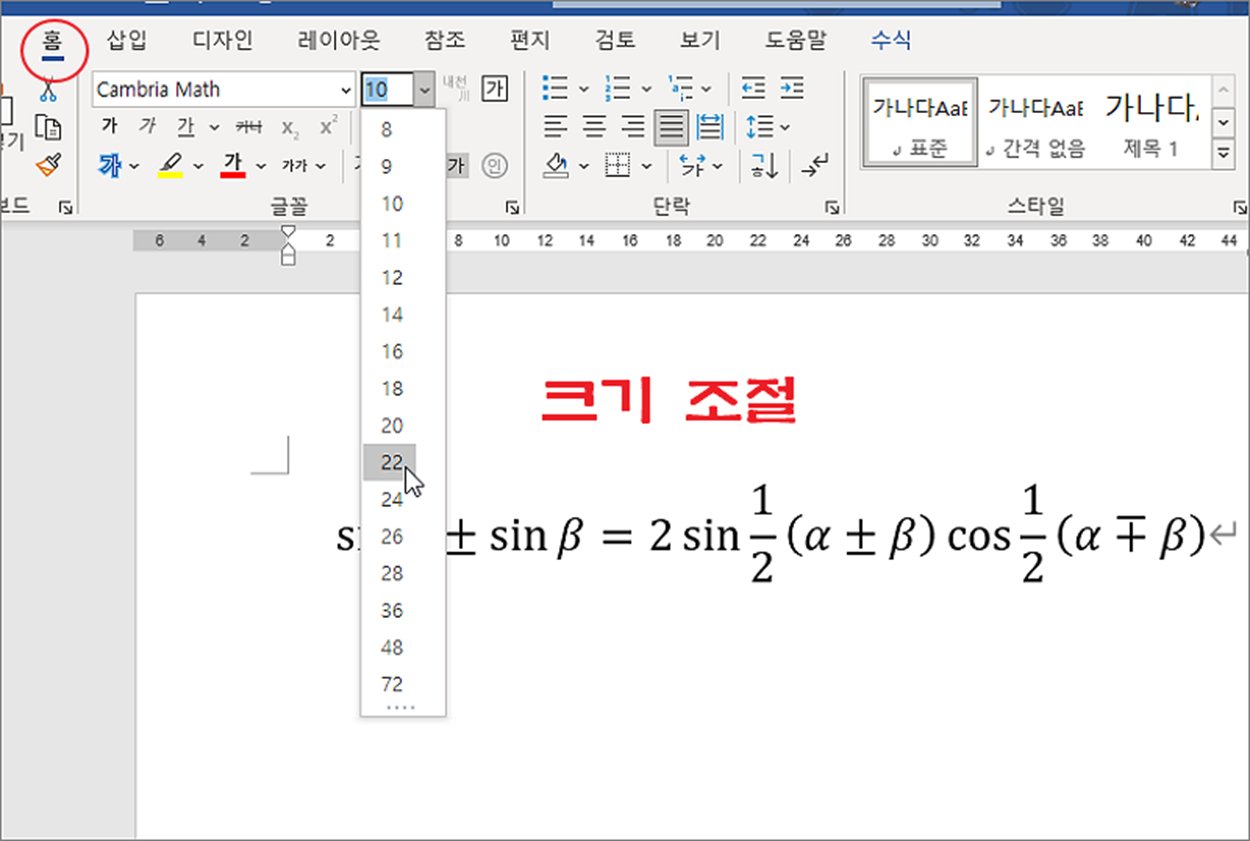▼ 다음은 이미지로 저장할 수식의 크기를 조절합니다. 10pt 가 작다고 생각되면 홈 탭으로 가서 서식을 수정합니다.