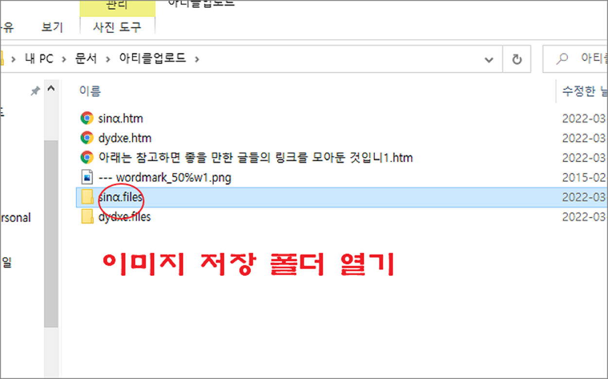 ▼ 워드 파일을 HTML 로 변환해서 저장한 폴더로 이동합니다. 이곳에는 html 파일과 동일한 이름의 폴더가 있을 겁니다. 워드에서 작성한 모든 개체와 이미지는 이곳에 보관이 됩니다.