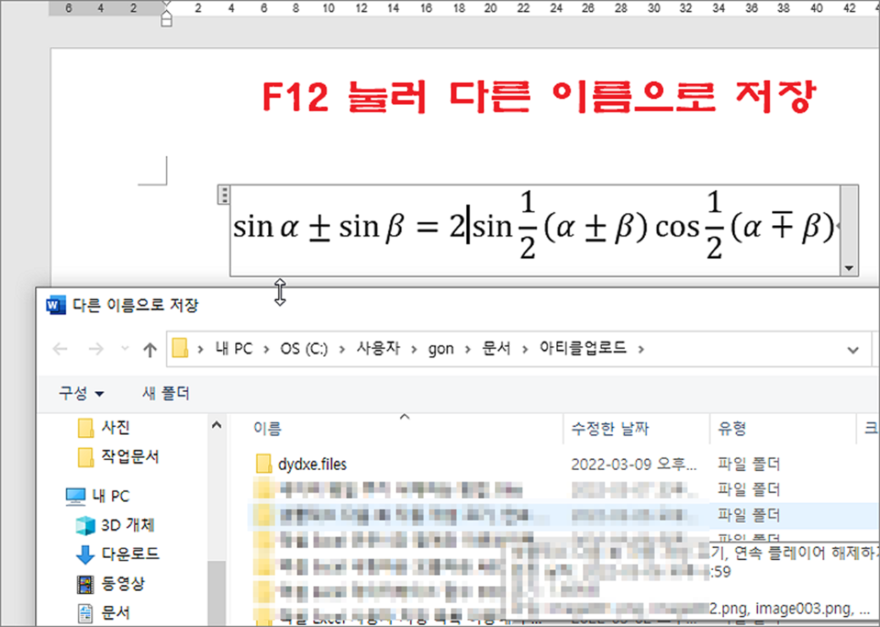 ▼ 이제 작성이 끝난 수식을 이미지로 변환해 보겠습니다. 방법은 간단합니다. 워드의 docx 포맷을 html 로 변경하면 끝납니다. F12 버튼을 눌러 다른 이름으로 저장 창을 띄웁니다.