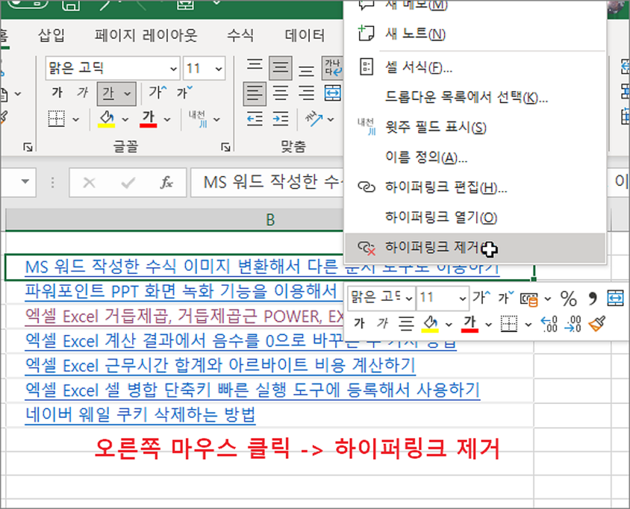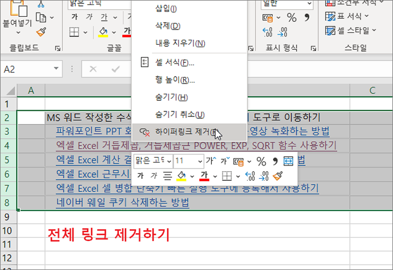 ▼ 여러 셀에 걸린 하이퍼링크를 제거하는 방법도 같습니다. 셀을 모두 선택하고 오른쪽 마우스를 눌러 하이퍼링크 제거 메뉴를 선택합니다.