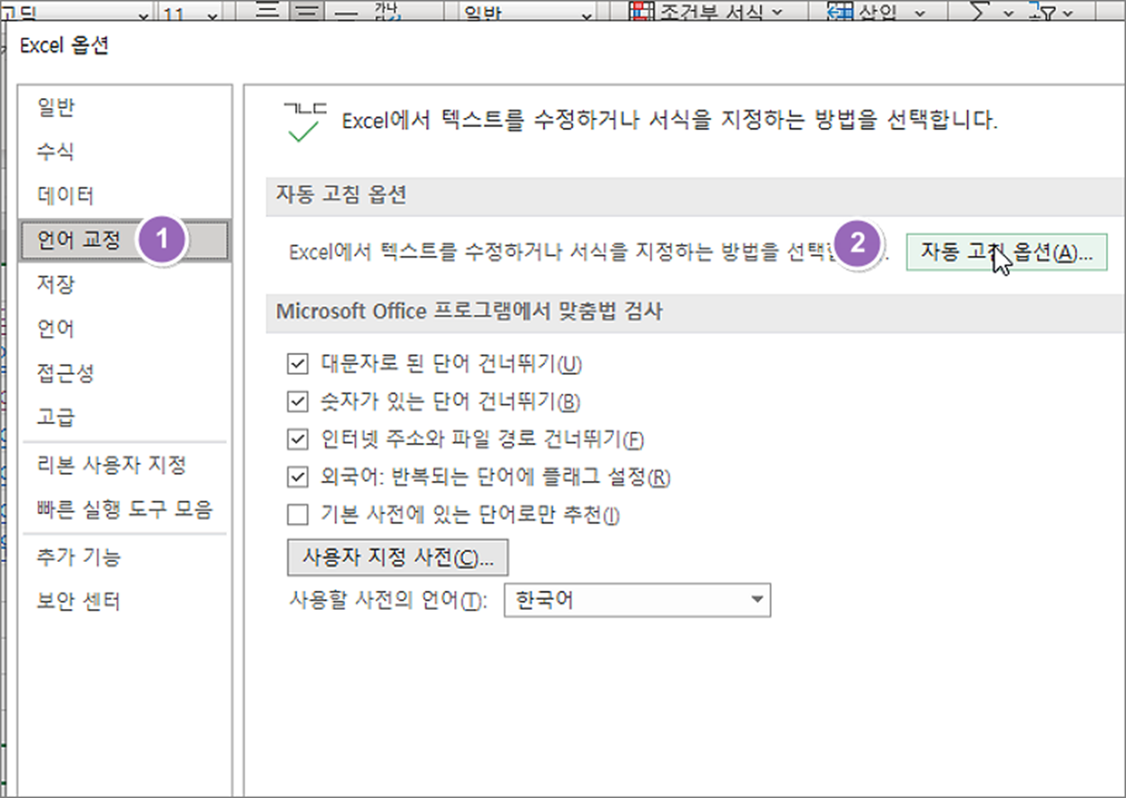 ▼ 세 번째 방법은 아예 하이퍼링크가 생기지 않도록 설정을 변경하는 것입니다. 단, 기존 설정된 하이퍼링크는 제거되지 않습니다. 홈 탭 > Excel 옵션 메뉴를 선택합니다. 엑셀 옵션 창에서 언어 교정 > 자동 고침 옵션 버튼을 클릭합니다.