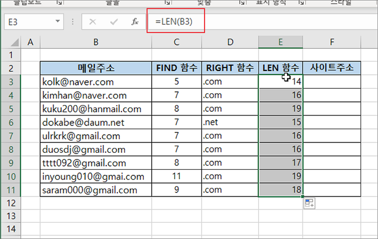 | ◎ 4. RIGHT 와 LEN 함수 사용해서 메일 주소 추출하기 |