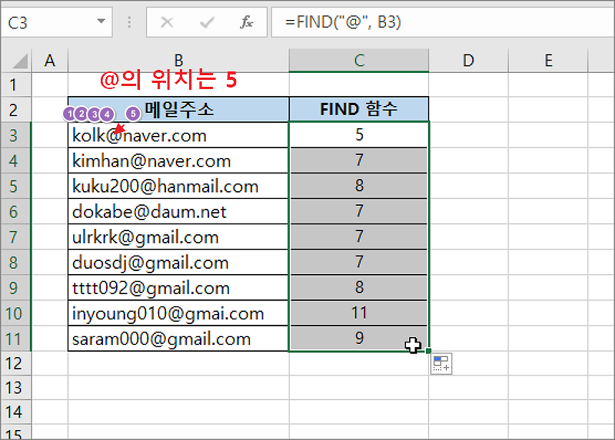 ▼ FIND 함수의 결과값은 다음과 같습니다. 왼쪽부터 알파벳을 세서 “@” 가 있는 위치값을 반환합니다.