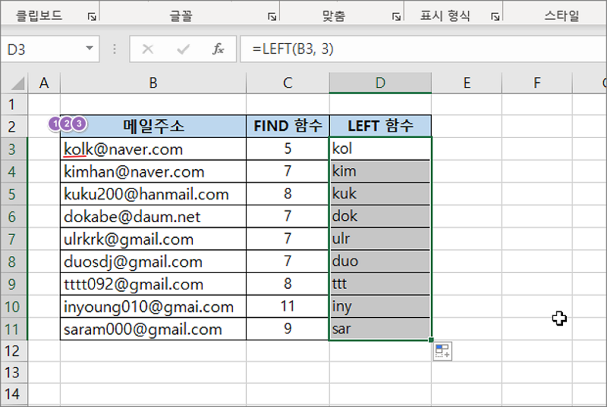 ▼ LEFT 의 두 번째 매개변수에 입력한 3 의 결과값은 다음과 같습니다. 메일주소의 앞에서 3번째까지의 텍스트를 잘라 반환합니다.