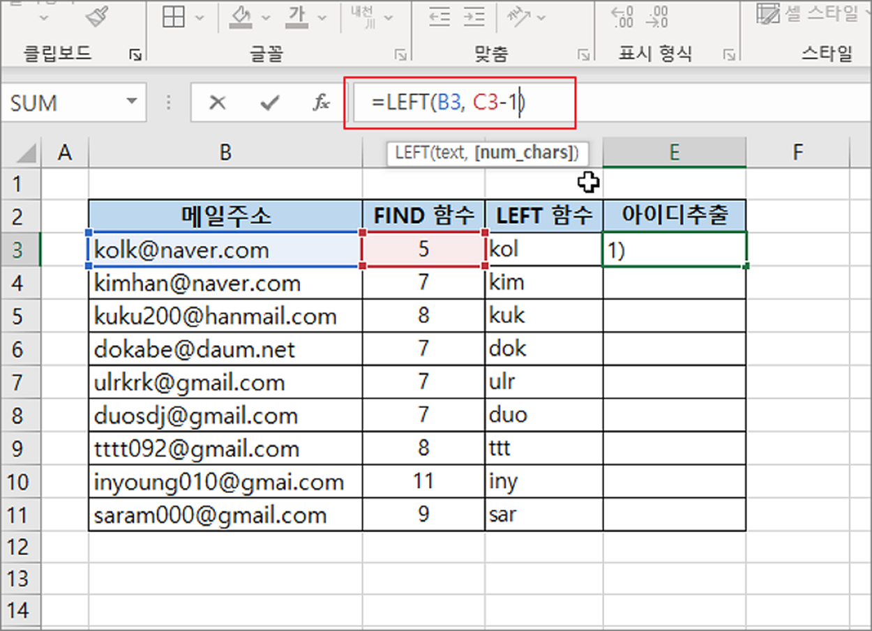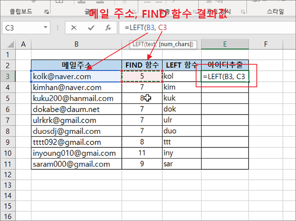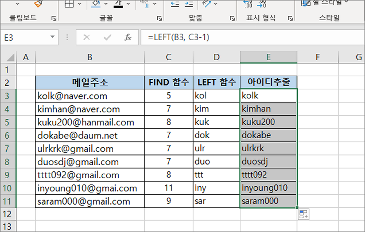▼ 결과는 다음과 같습니다. FIND 와 LEFT 함수를 이용해서 메일주소 앞부분인 아이디를 출력해 보았습니다.