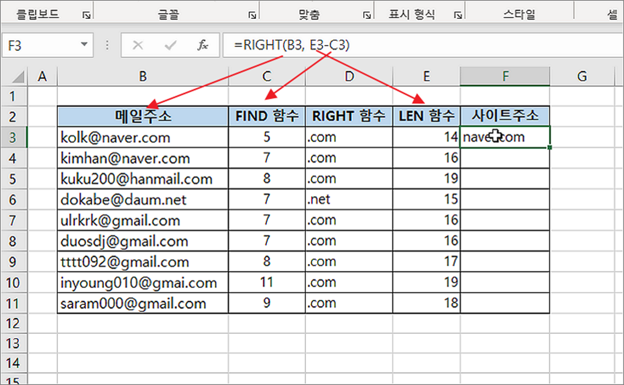 ▼ RIGHT 함수의 첫 번째 매개변수에 메일주소를 입력하고, 두 번째 매개변수에는 LEN 함수로 구한 텍스트의 전체길이와 FIND 함수로 찾은 @ 의 위치값을 뺀 수식을 입력합니다.