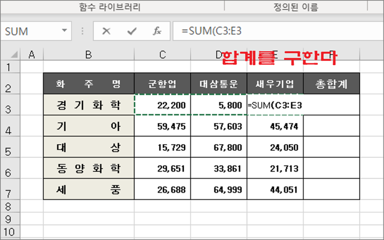 ▼ 먼저 샘플에서 가로 줄에 있는 값을 모두 합치기 위해 SUM 함수를 사용합니다.