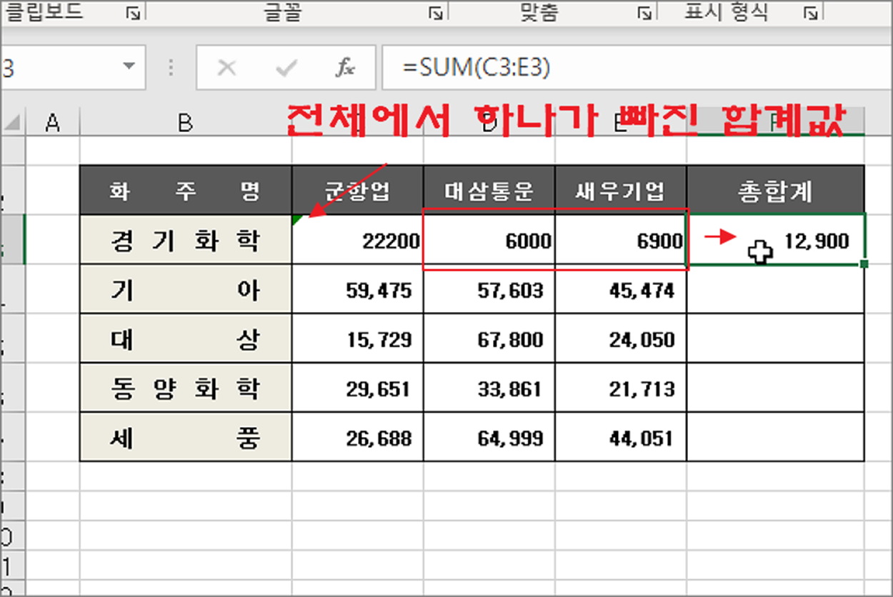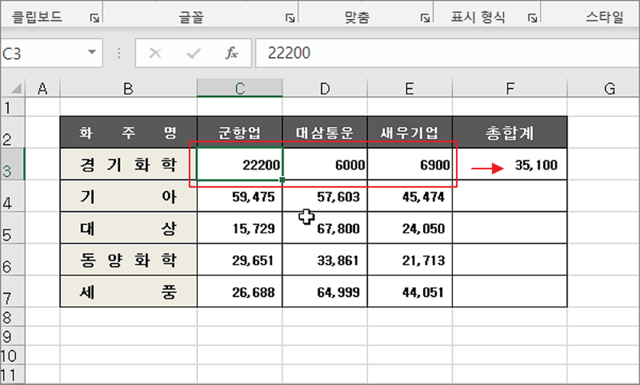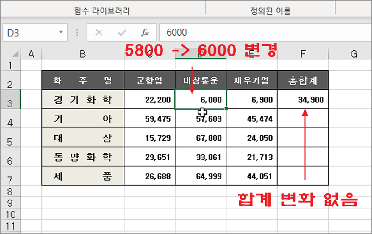 ▼ 다음은 합계를 구할 때 참조한 셀 중 하나의 값을 변경해 봅니다. 만약 합계로 구한 값의 변화가 없다면 자동 계산이 되지 않는 것입니다. 자동 계산 옵션이 제대로 설정되어 있는지 확인합니다.