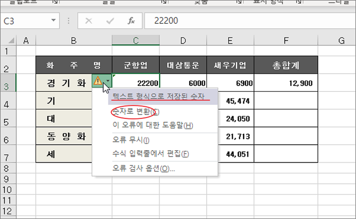 ▼ 화살표에 마우스를 가져가면 느낌표와 함께 버튼이 나타납니다. 화살표를 클릭해서 하위 메뉴를 띄웁니다. 그리고 오류 메시지를 확인하고 바로 아래에 추천하는 설정 메뉴를 선택합니다. 셀 서식이 텍스트 형식이라 오류가 났다는 설명입니다. “숫자로 변환” 메뉴를 선택해서 서식을 변경합니다.