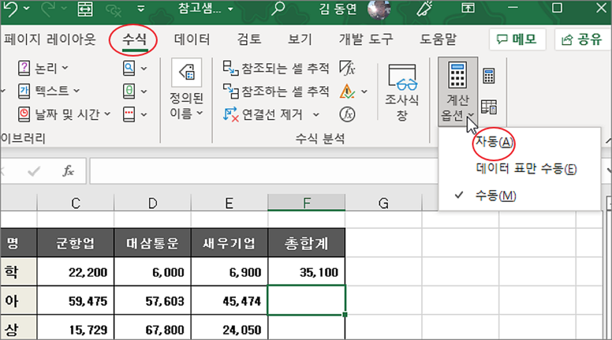 ▼ 수식 탭 > 계산 옵션 리본 메뉴를 클릭합니다. 하위 메뉴에서 자동 으로 체크되어 있는지 확인합니다.