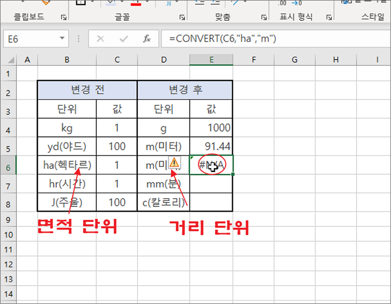 ▼ 다음은 서로 다른 단위 그룹을 참조할 경우입니다. 같은 그룹에 해당하는 단위만 변환이 가능합니다. CONVERT 는 #N/A 를 반환합니다.