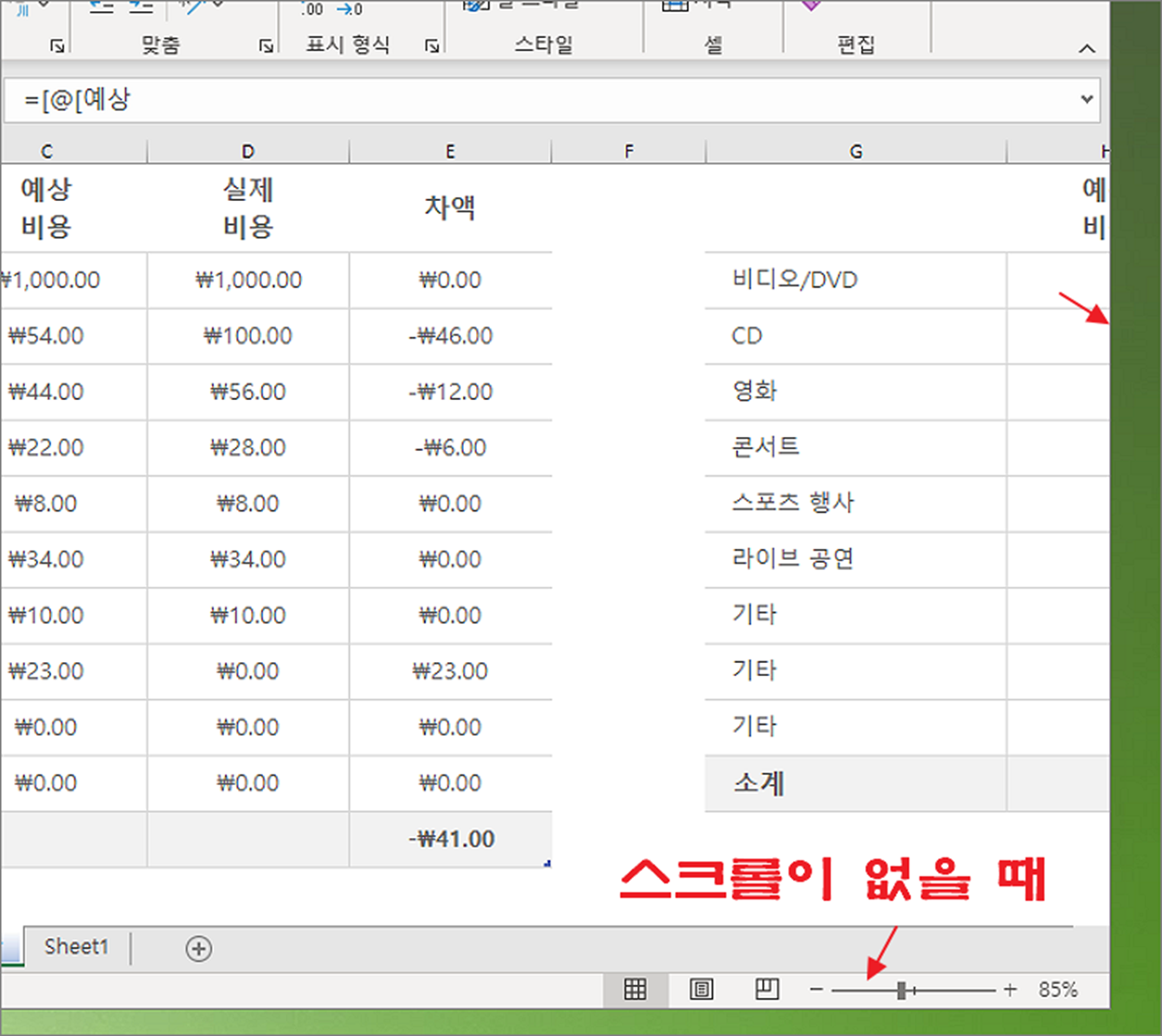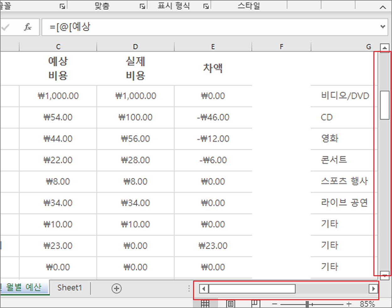 ▼ 옵션을 변경한 결과는 다음과 같습니다. 이전에 보이지 않던 스크롤바가 오른쪽 사이드와 시트 하단에 나타났습니다.