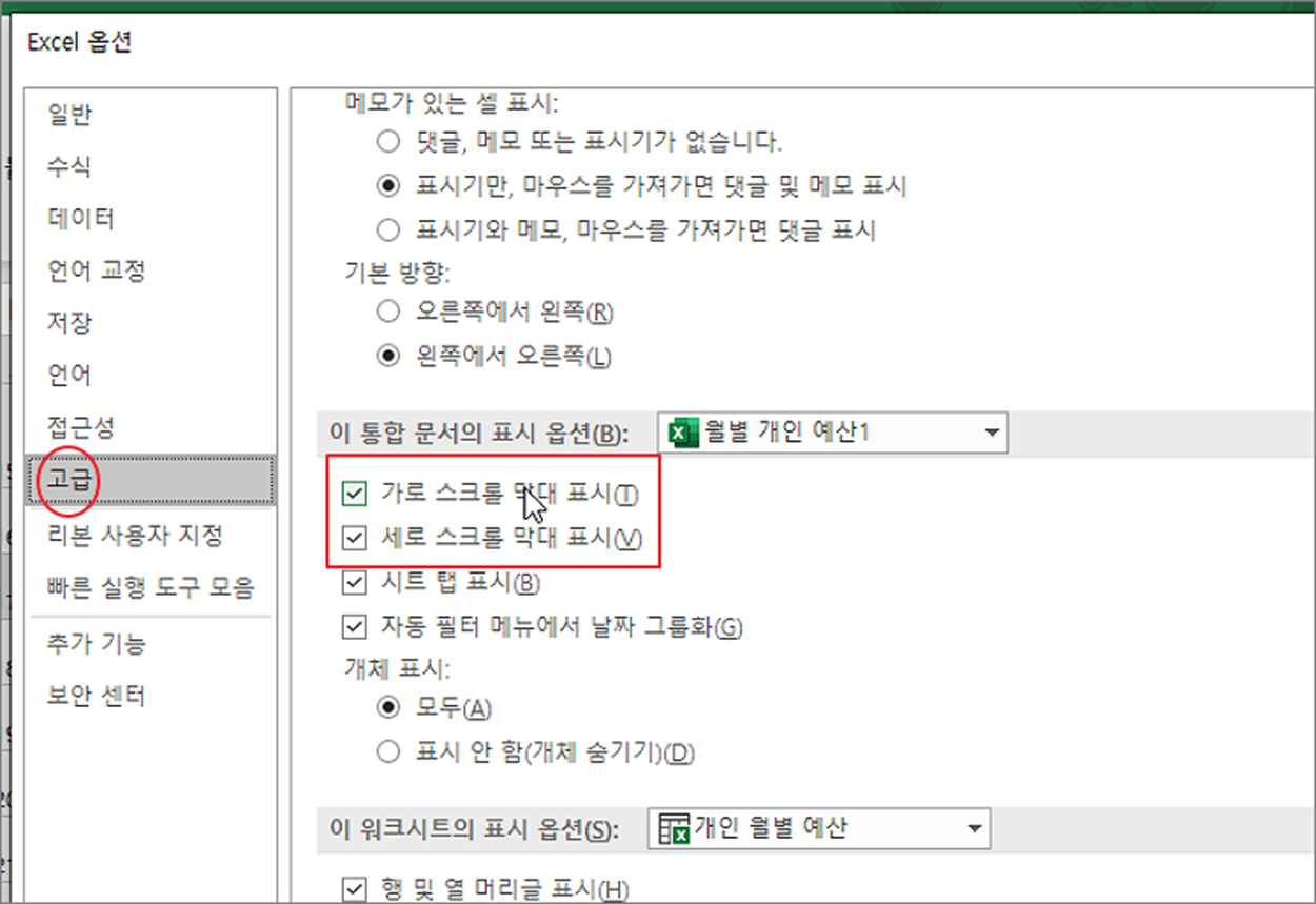▼ 엑셀 옵션 창에서 고급 메뉴로 이동합니다. 그리고 이 통합 문서의 표시 옵션 항목에서 “가로 스크롤 막대 표시” 와 “세로 스크롤 막대 표시” 가 체크되어 있는지 확인합니다.