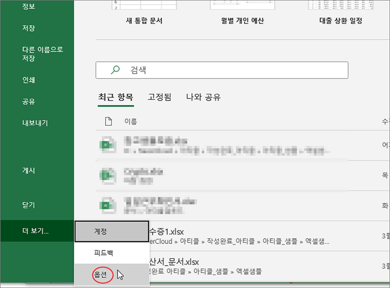▼ 파일 탭 > 옵션 메뉴를 눌러 엑셀 옵션 창을 띄웁니다.