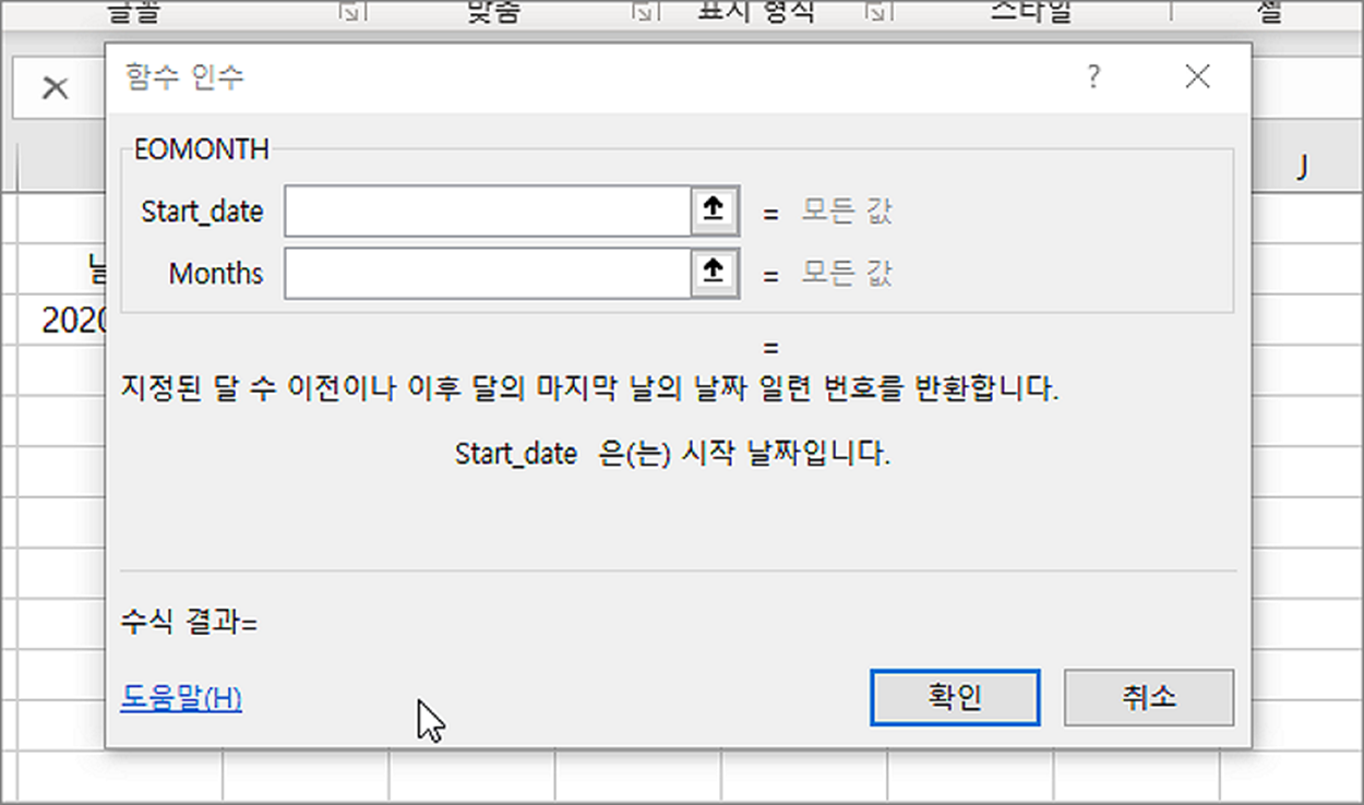 ▼ EOMONTH 의 함수 레이아웃은 다음과 같습니다. 두 개의 매개변수를 가집니다. Start_date 에 입력한 값을 기준으로 Months 값으로 개월수를 빼거나 더합니다. 그리고 계산된 날짜에 해당하는 달의 마지막 날을 계산해서 반환합니다.