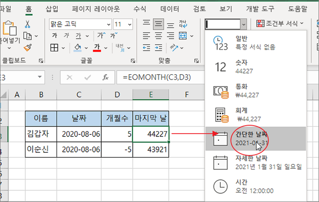 ▼ 반환한 값이 숫자인 경우 셀 서식 변경을 통해 날짜로 변환해서 볼 수 있습니다. 셀을 선택하고 홈 탭 > 서식에서 “간단한 날짜” 또는 “자세한 날짜” 를 선택합니다.