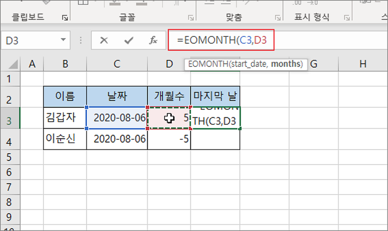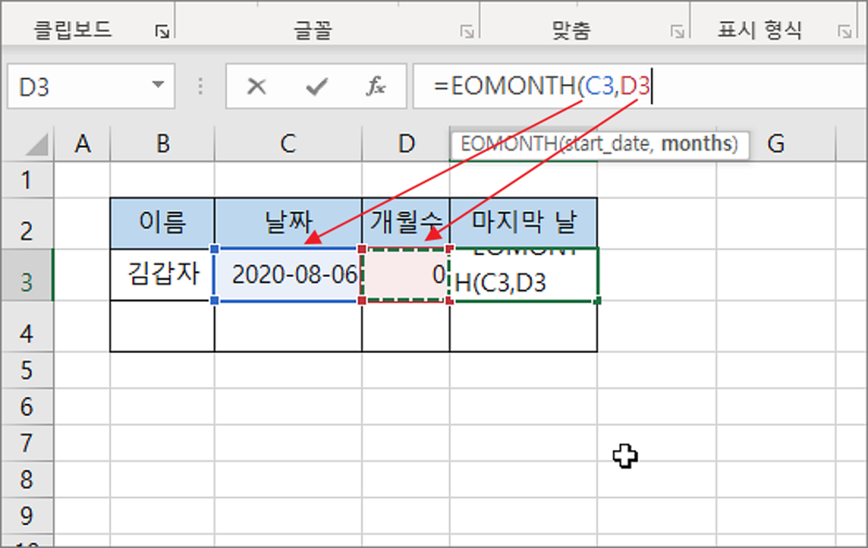 ▼ EOMONTH 함수에서 첫 번째 매개변수에 날짜를 입력합니다. 두 번째 매개변수에는 계산할 개월 수를 입력합니다.