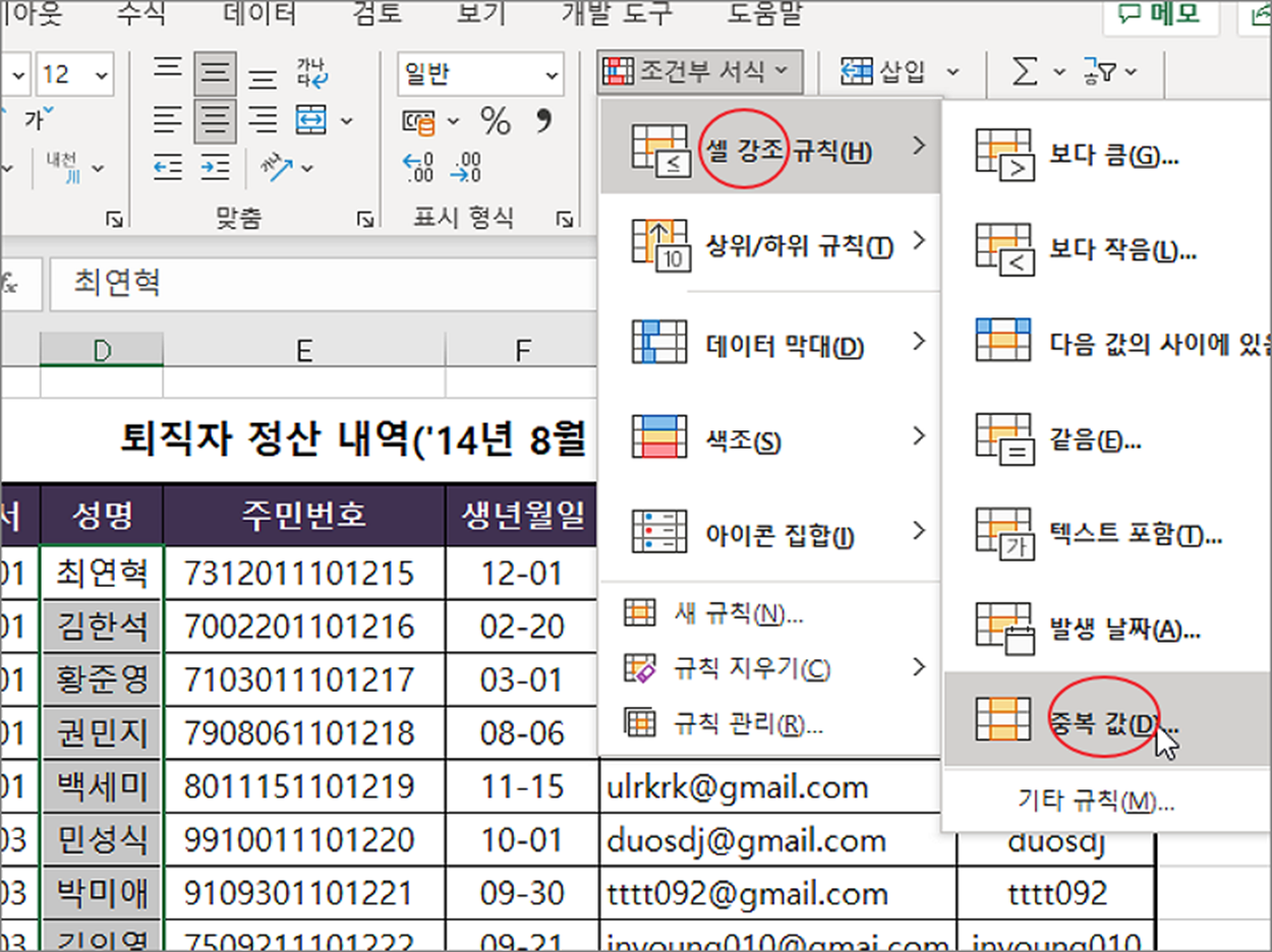 ▼ 두 번째 조건부 서식에서 사용할 만한 기능은 “중복 값” 입니다. 검색할 대상이 정해져 있지 않은 경우 주로 사용합니다. 전체 데이터에서 2개 이상 중복 값을 모두 찾아 표시합니다. 조건부 서식 > 셀 강조 규칙 > 중복 값 리본 메뉴를 선택합니다.