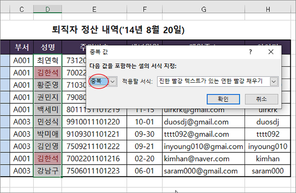 ▼ 중복 값 창이 뜨면 왼쪽 옵션이 중복으로 선택되어 있는지 확인하고 서식을 정한 후 확인 버튼을 클릭합니다.