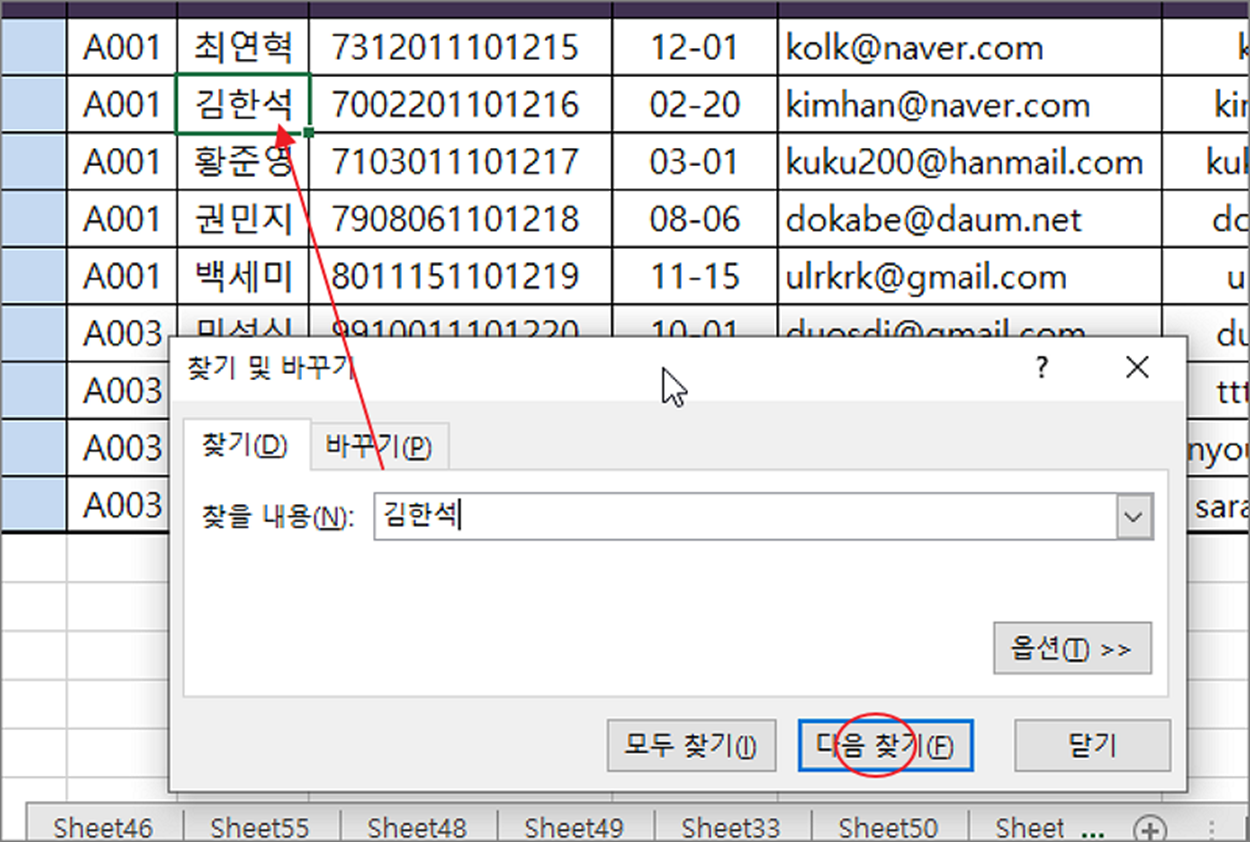 ▼ 찾기 탭으로 이동해서 “찾을 내용” 에 검색어를 입력합니다. 그리고 화면 아래에 다음 찾기 버튼을 눌러 검색을 시작합니다.