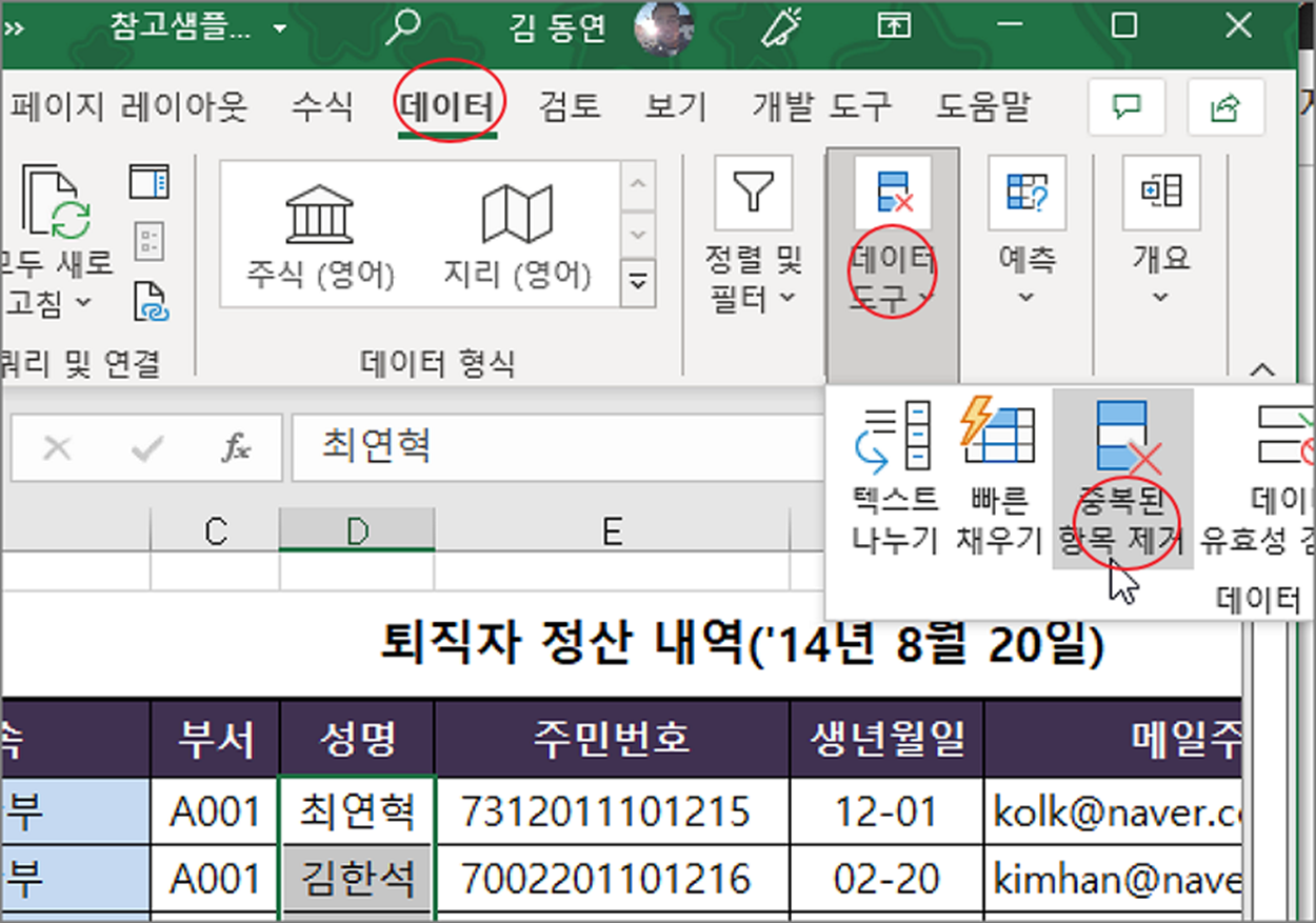 | ◎ 3. 중복된 항목 제거 기능 이용하기 |