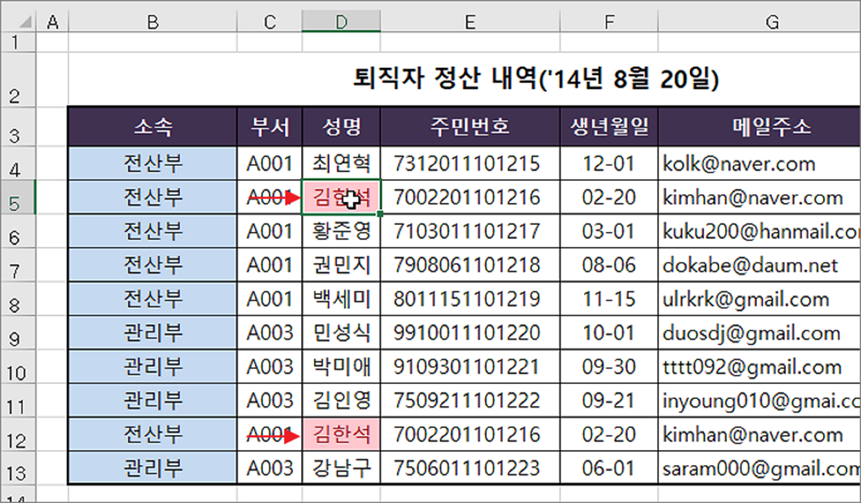 ▼ 결과는 다음과 같습니다. 조건부 서식의 “같음” 에 입력한 값이 든 셀이 지정한 서식으로 바뀐 것을 확인할 수 있습니다.