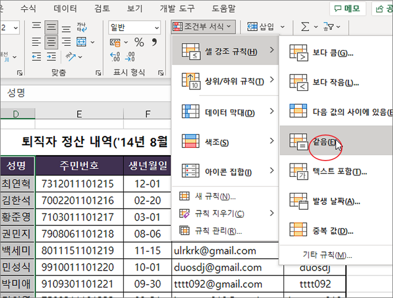 ▼ 다음 조건부 서식 > 셀 강조 규칙 > 같음 메뉴를 차례대로 클릭합니다.