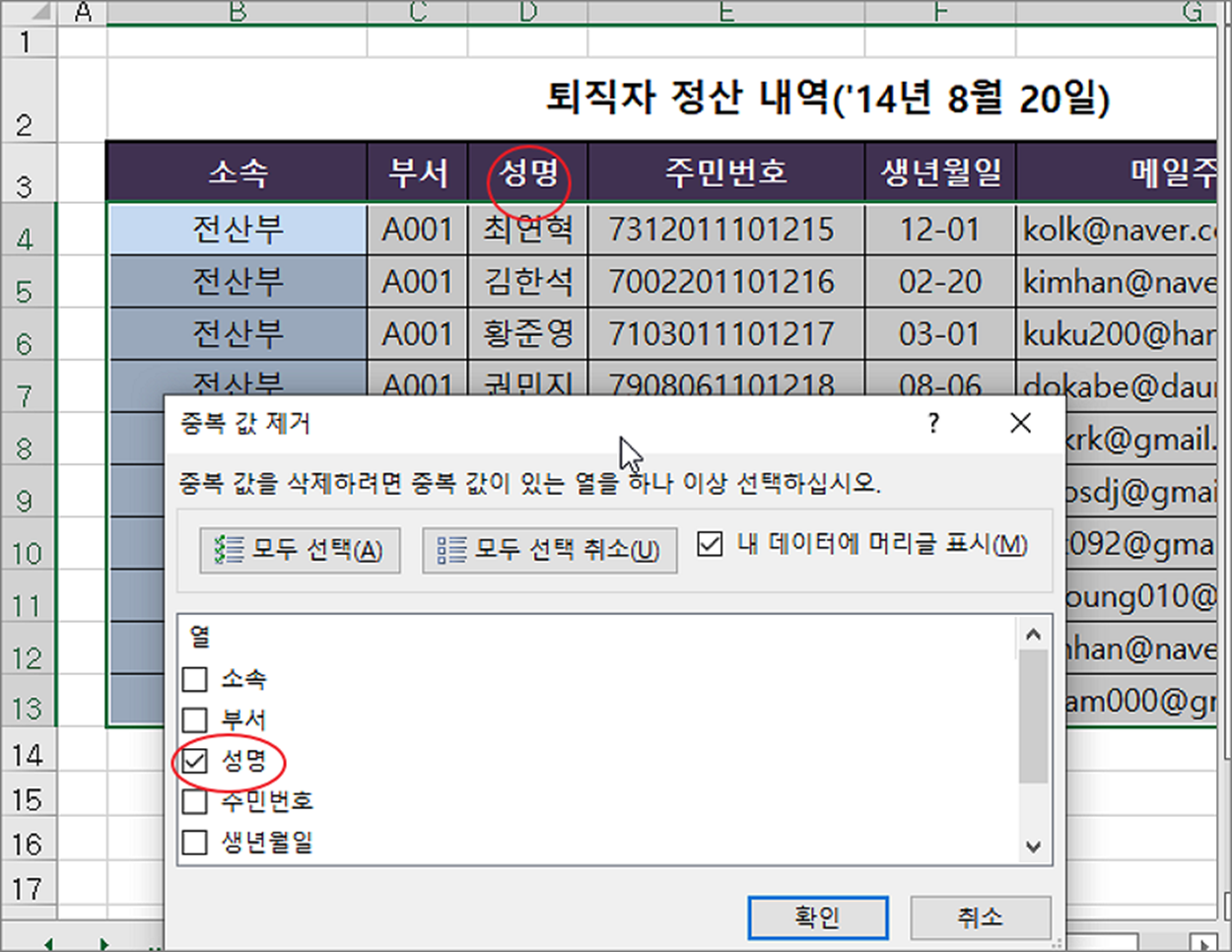 ▼ 다음 화면에서는 중복 값이 있는 열을 선택해야 합니다. 필요한 열을 체크하고 확인 버튼을 클릭합니다.
