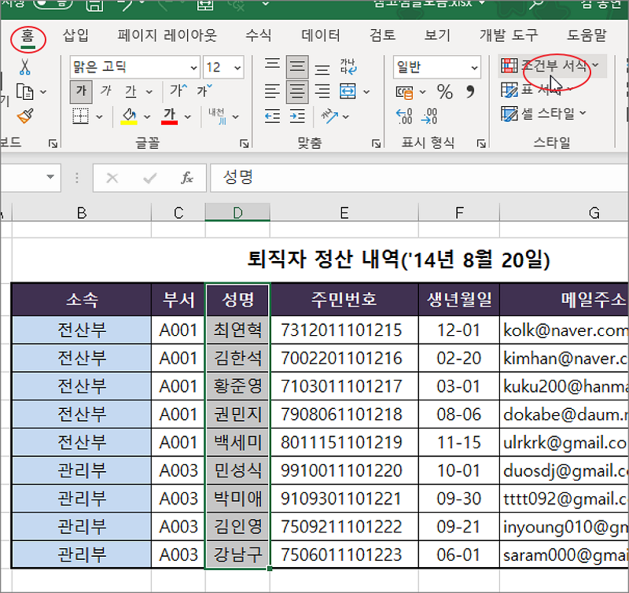 ▼ 두 번째는 조건부 서식을 이용하는 방법입니다. “조건부 서식” 이란 설정한 조건에 맞는 셀이 있는 경우 사용자가 지정한 서식으로 변경하는 기능입니다. 한 눈에 중복값을 찾아 보고 싶을 때 주로 사용합니다. 홈 탭 > 조건부 서식 리본 메뉴를 클릭합니다.