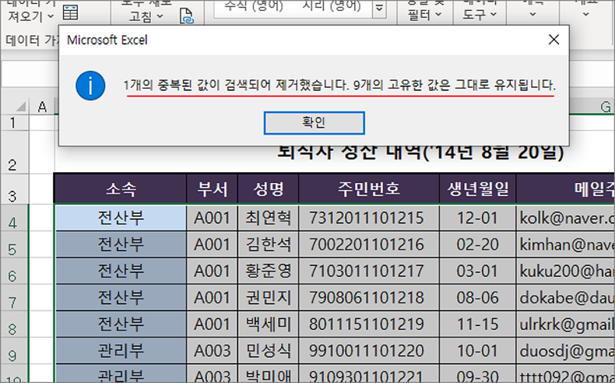 ▼ 결과는 다음과 같습니다. 화면에는 중복 값을 삭제한 결과 메시지를 보여줍니다. 표 형태인 경우 해당하는 중복 값이 있는 열 전체를 삭제합니다.
