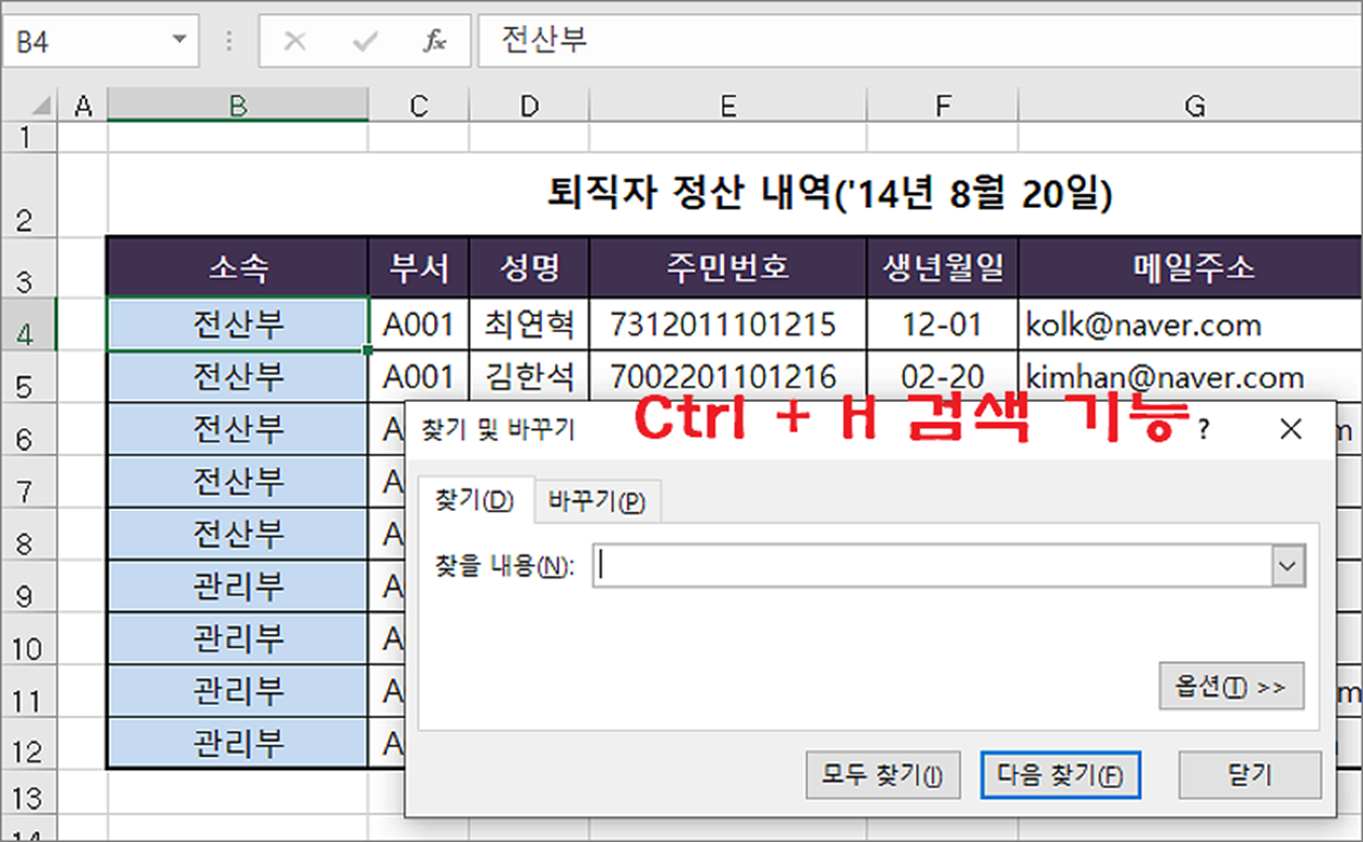 ▼ 먼저 검색으로 중복값을 찾는 방법입니다. Ctrl + F 또는 Ctrl + H 를 눌러 찾기 및 바꾸기 창을 띄웁니다.