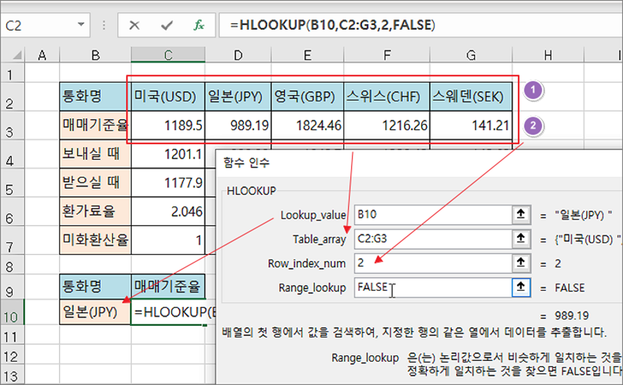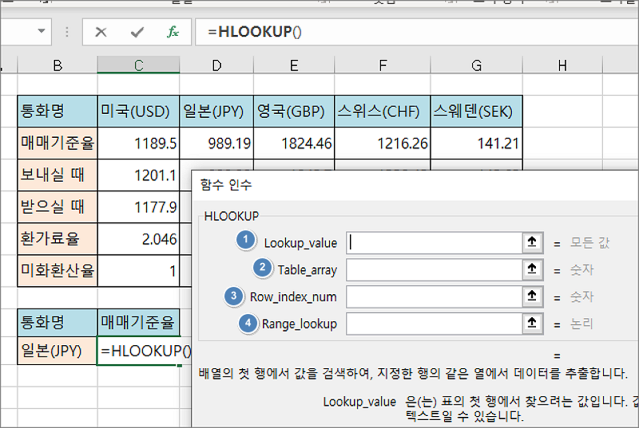▼ 이제 4개의 매개변수를 채워보겠습니다. 첫 번째로 Lookup_value 는 표에서 검색할 값을 참조합니다. 샘플에서는 통화명에 해당합니다. 두 번째 Table_array 는 검색할 전체 영역을 입력합니다. 행을 더 넓혀서 원하는 데이터를 찾을 수도 있습니다. 세 번째로 “매매기준율”의 값이 표에서 두 번째 행이므로 2 를 입력했습니다. 네 번째는 선택 사항입니다. 저는 정확한 값 조회를 위해서 FALSE 를 입력했습니다.