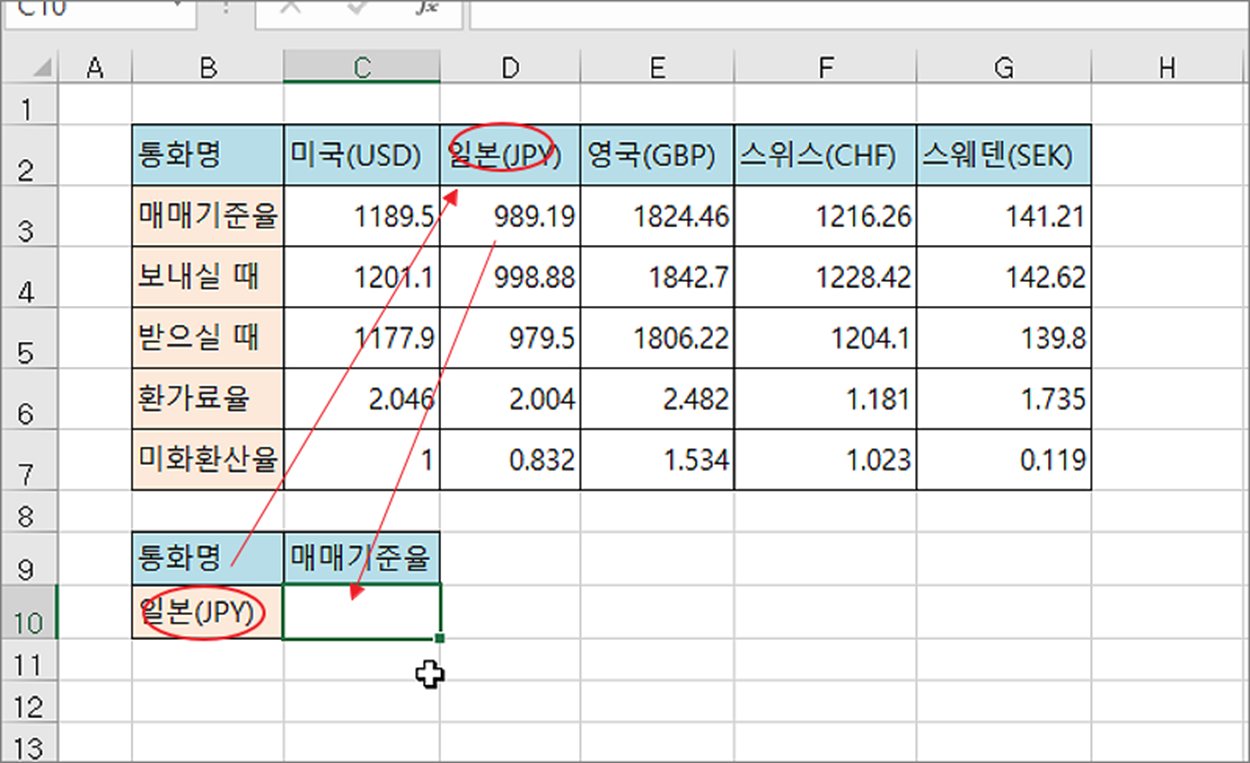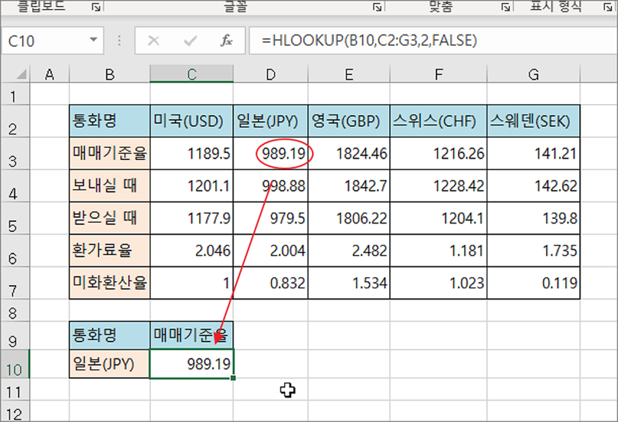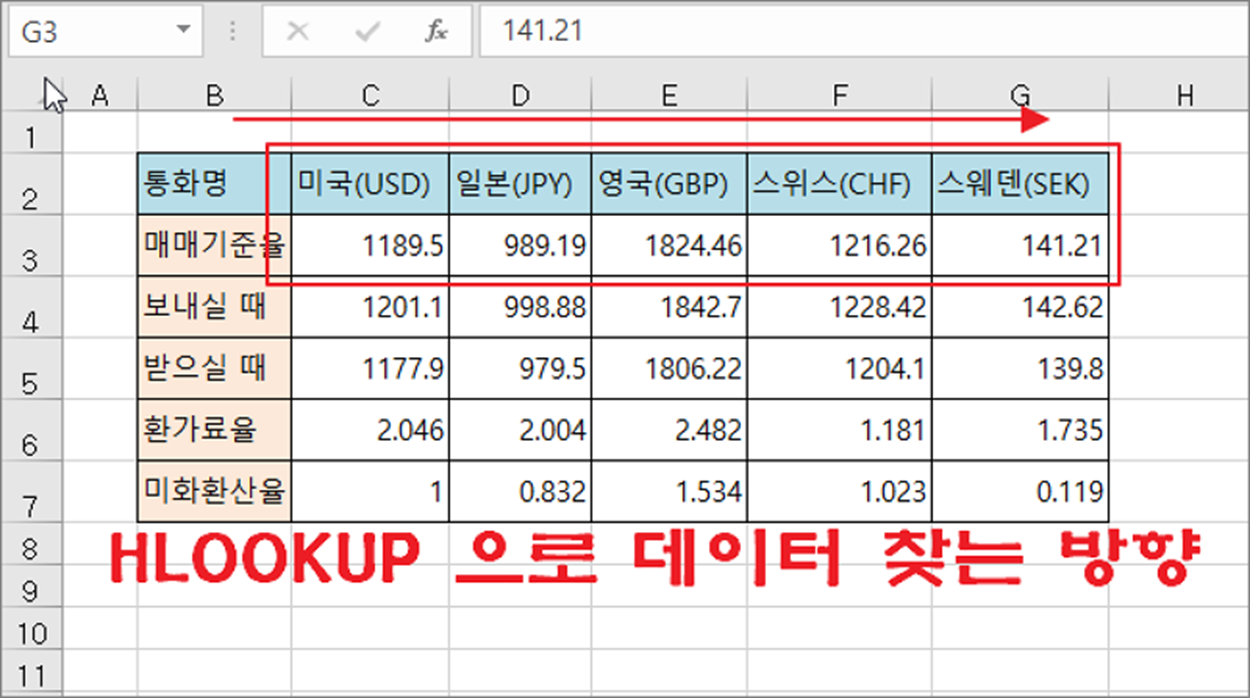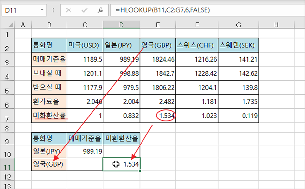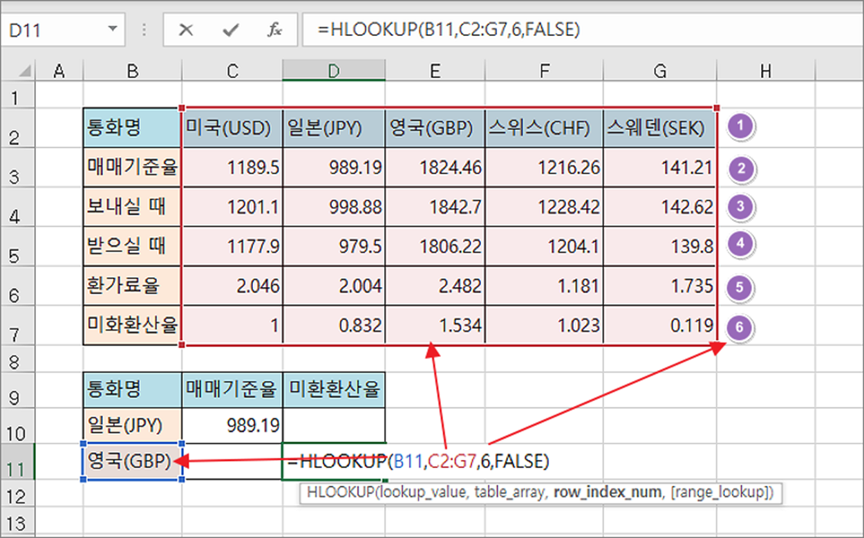 ▼ 다음은 좀더 범위를 넓혀서 원하는 값을 찾아보겠습니다. 방법은 간단합니다. 표에서 두 번째 매개변수인 Table_array 의 영역을 넓혀 주고 행 번호를 바꿉니다. 표에서 미화환산율이 여섯 번째 행이므로 6을 입력합니다.