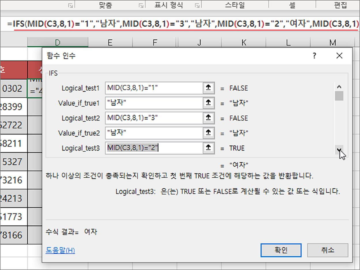 ▼ 위의 수식이 조금 복잡하게 보인다면 아래 소개한 다른 방법을 사용해 보세요. IFS 와 MID 함수 두 개로 구현하였습니다. IFS 는 IF 함수를 여러 개 합친 것과 같습니다. 두 개의 매개변수를 쌍으로 입력해야 합니다. 첫 번째에는 조건이 들어가고 두 번째에 첫 번째의 조건이 참(TRUE)일 경우 반환할 값을 입력합니다. FALSE 인 경우는 제외합니다. IFS 함수의 레이아웃은 다음과 같습니다.